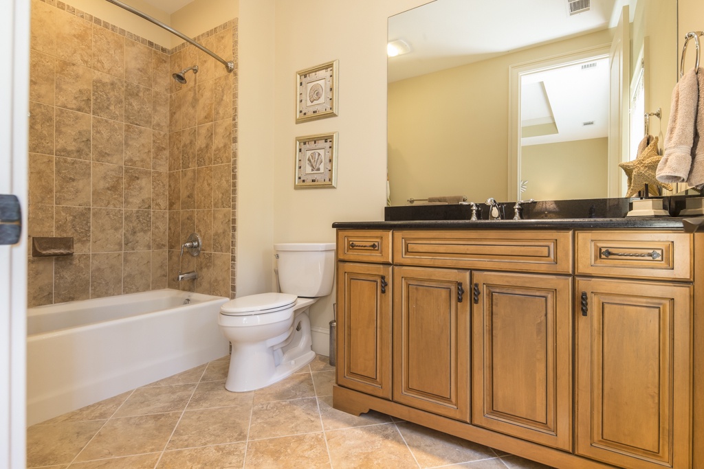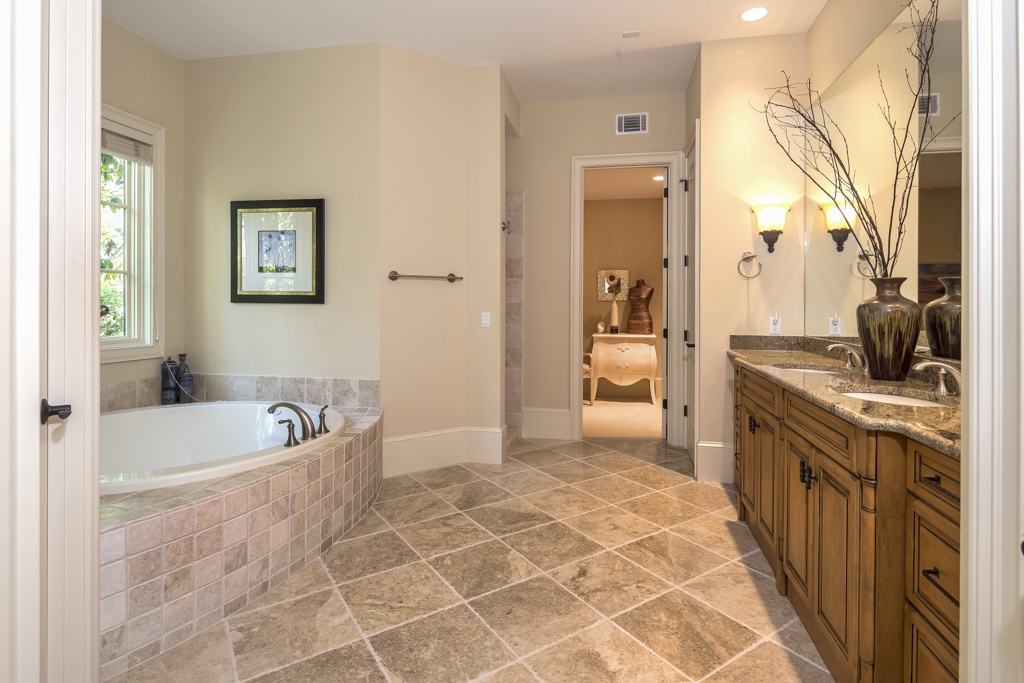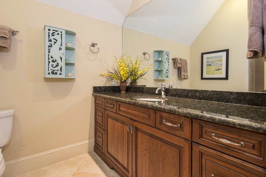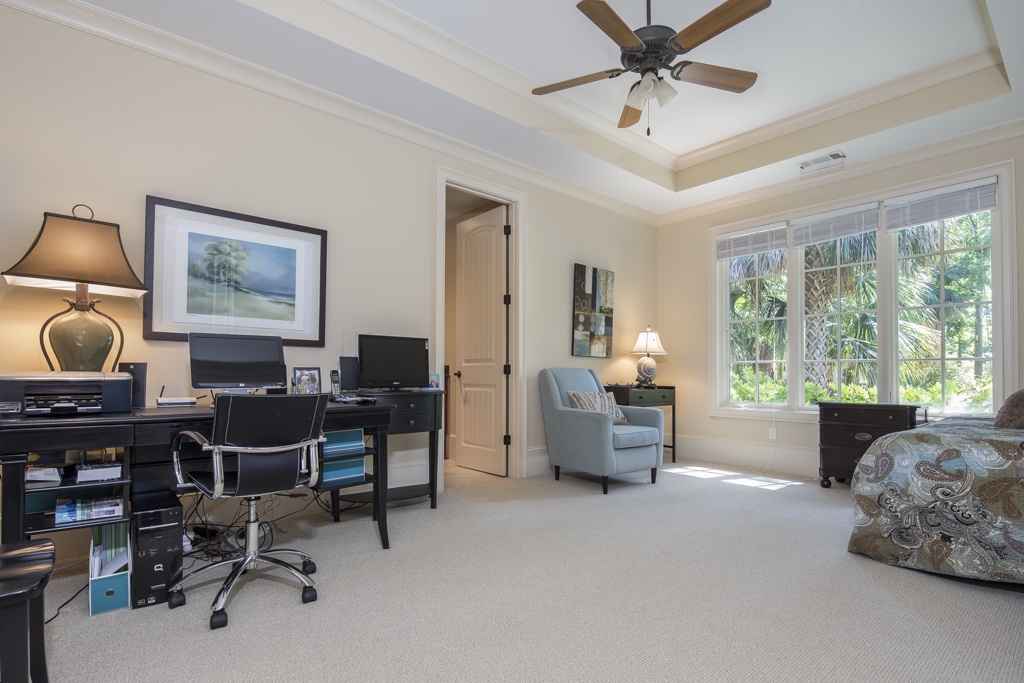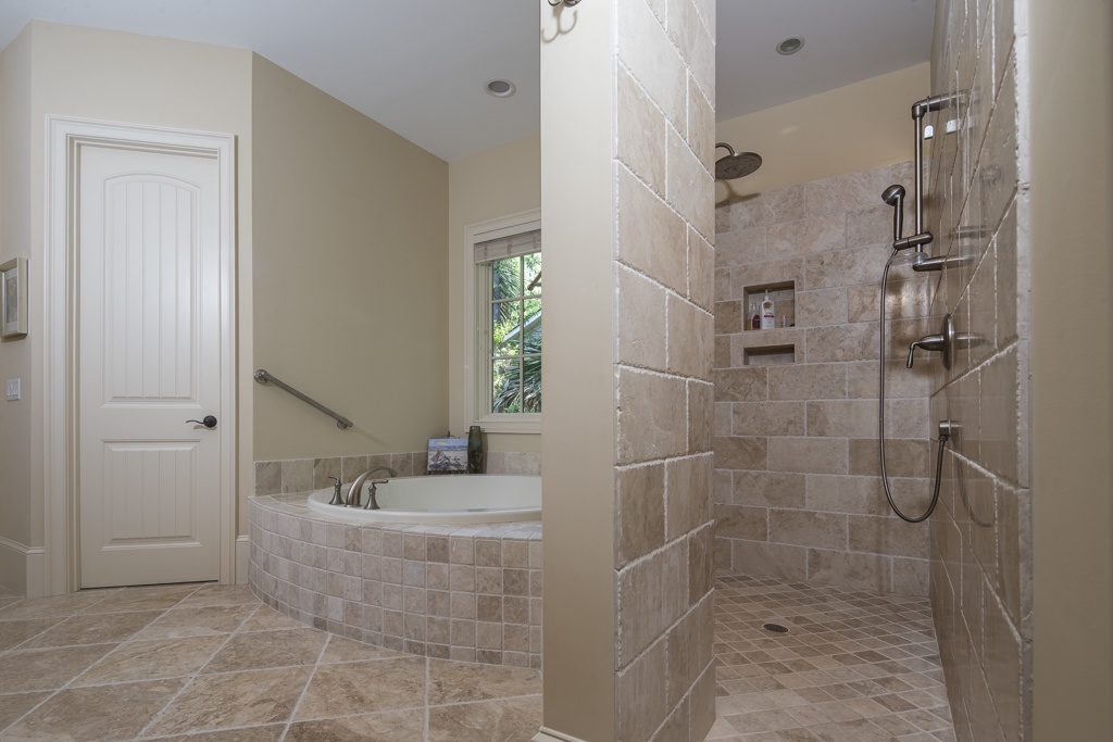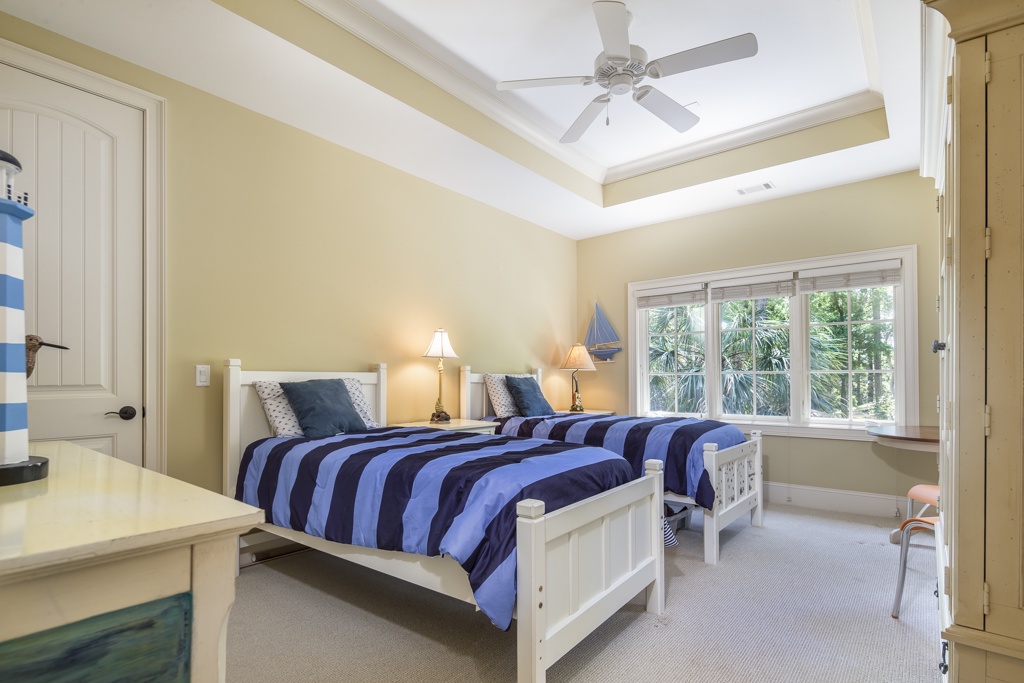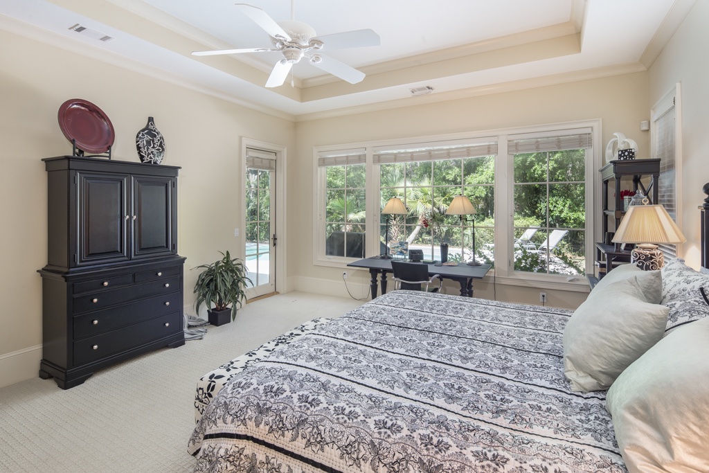 The same dedication to spaciousness and elegance can be found among the property’s six bedrooms, four of which can be found on the second story. The first we come to sees a king bed set beneath tall ceilings and before a panoramic view of the rear garden. Lushly appointed, this suite’s amenities include flat-screen TV, ceiling fan and en suite with his-and-hers vanities, soaking tub and walk-in shower. The second upstairs bedroom, just off the grand balcony overlooking the great room, enjoys a king-size bed, flat-screen TV and private en suite with tub and shower.