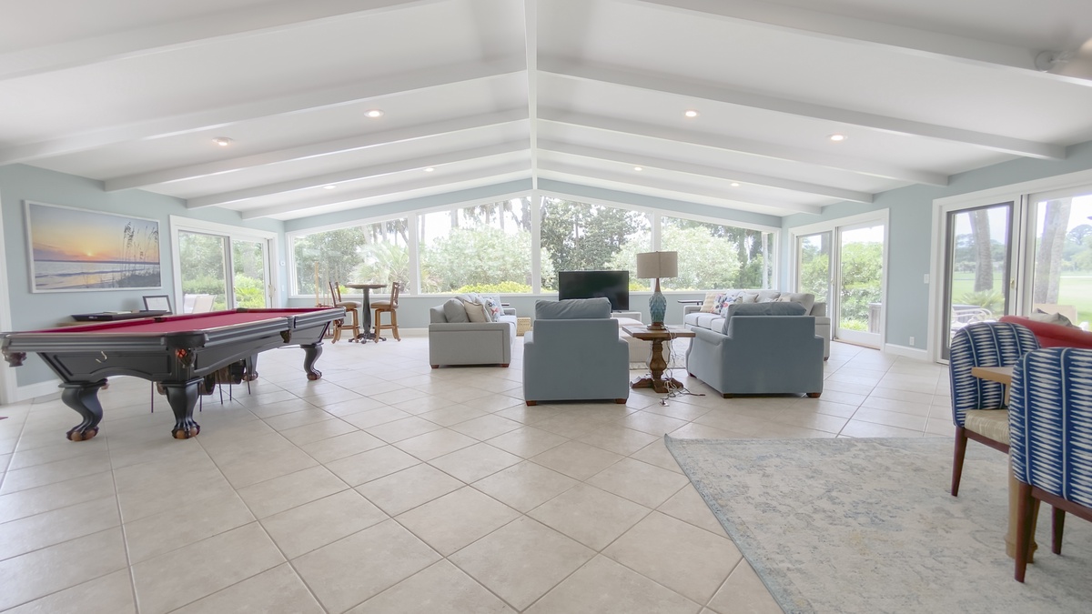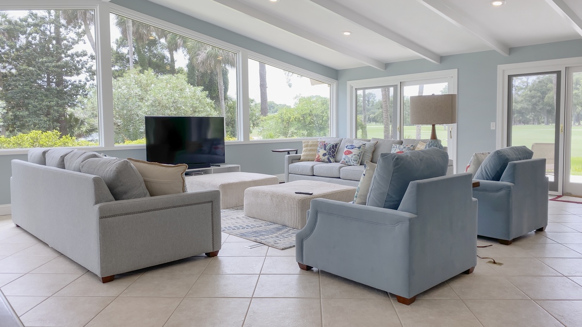 The heart of the home lies in the massive great room, where cathedral ceilings soar above three walls of tall windows and sliding glass doors that draw your gaze from the driving range at Plantation Golf Club across the 1st and 18th holes at Heron Point by Pete Dye as well as the 5th and 6th at Atlantic Dunes by Davis Love III. A large decorative fireplace flanks one side, facing the entry to the massive pool deck.