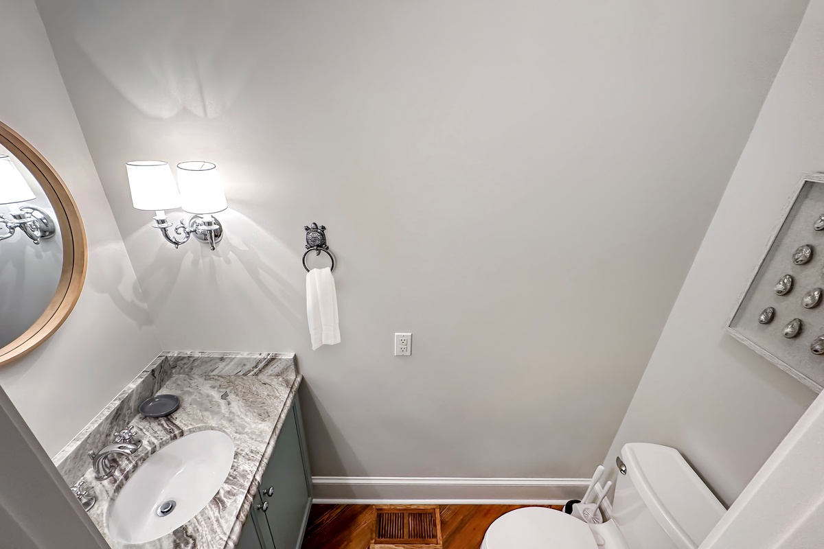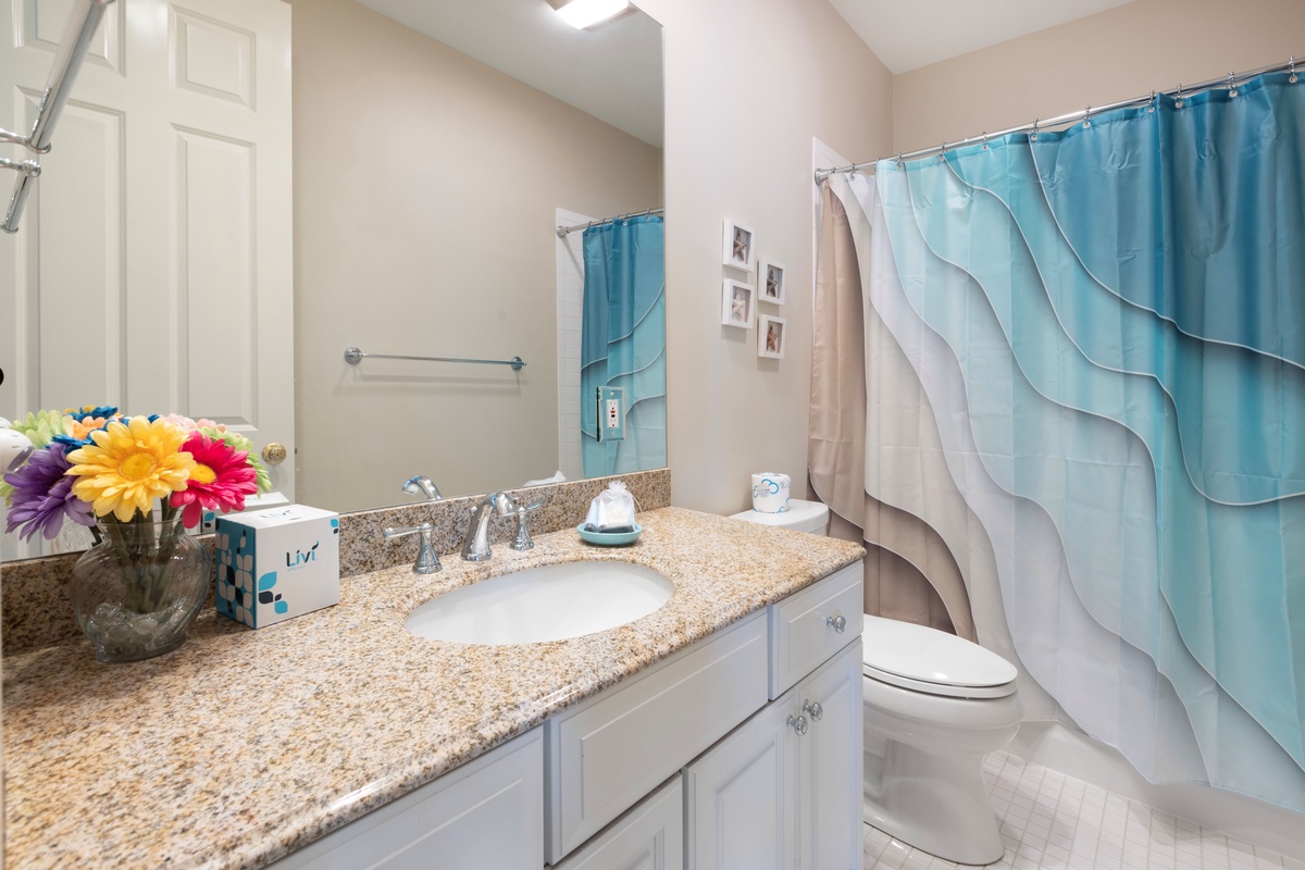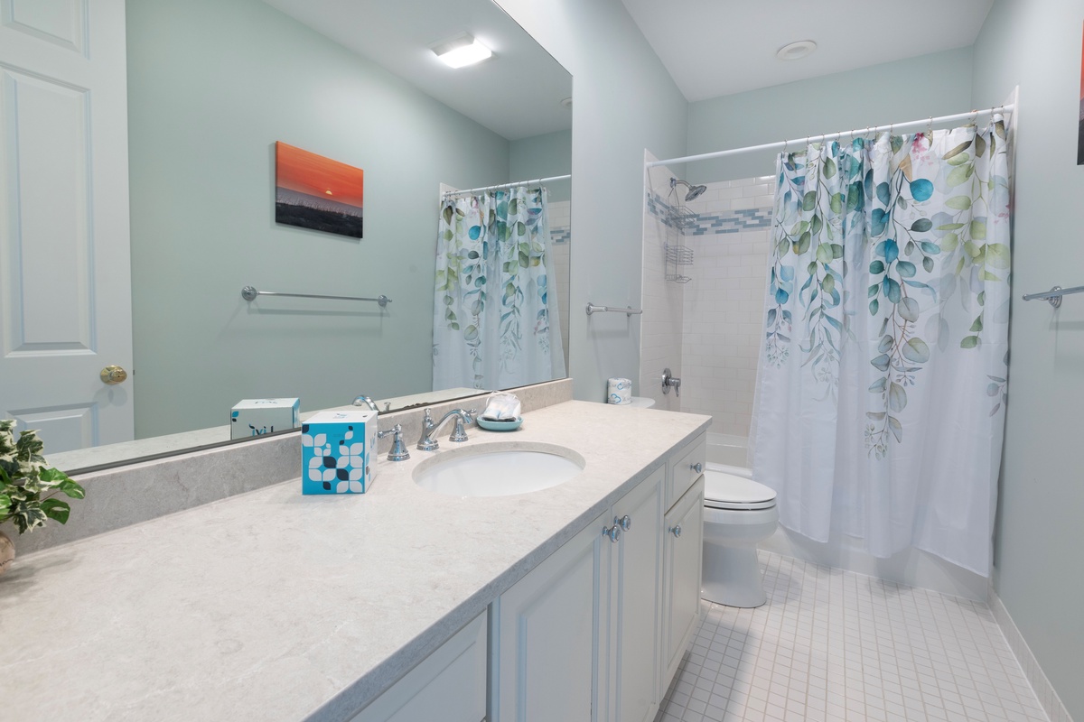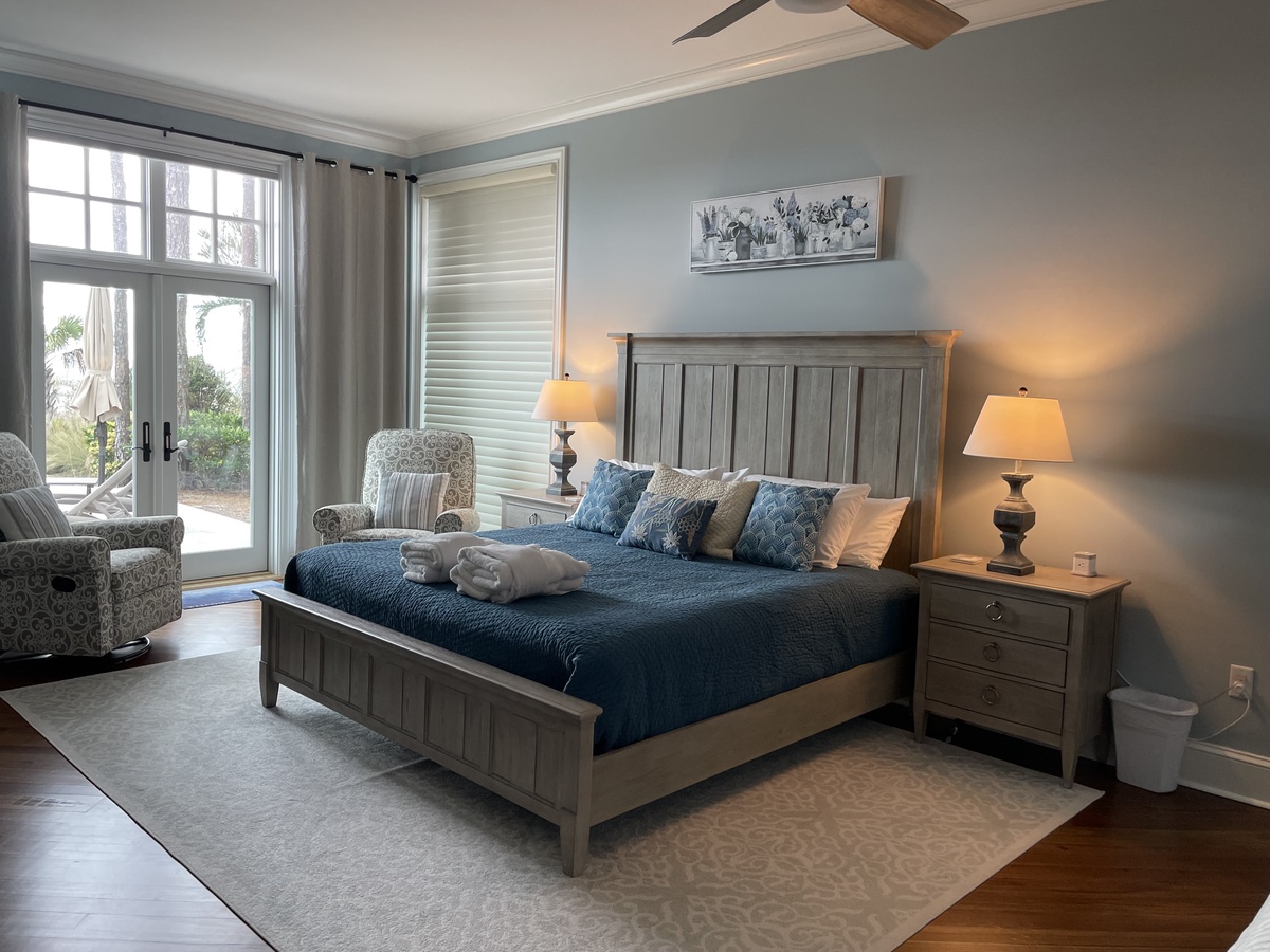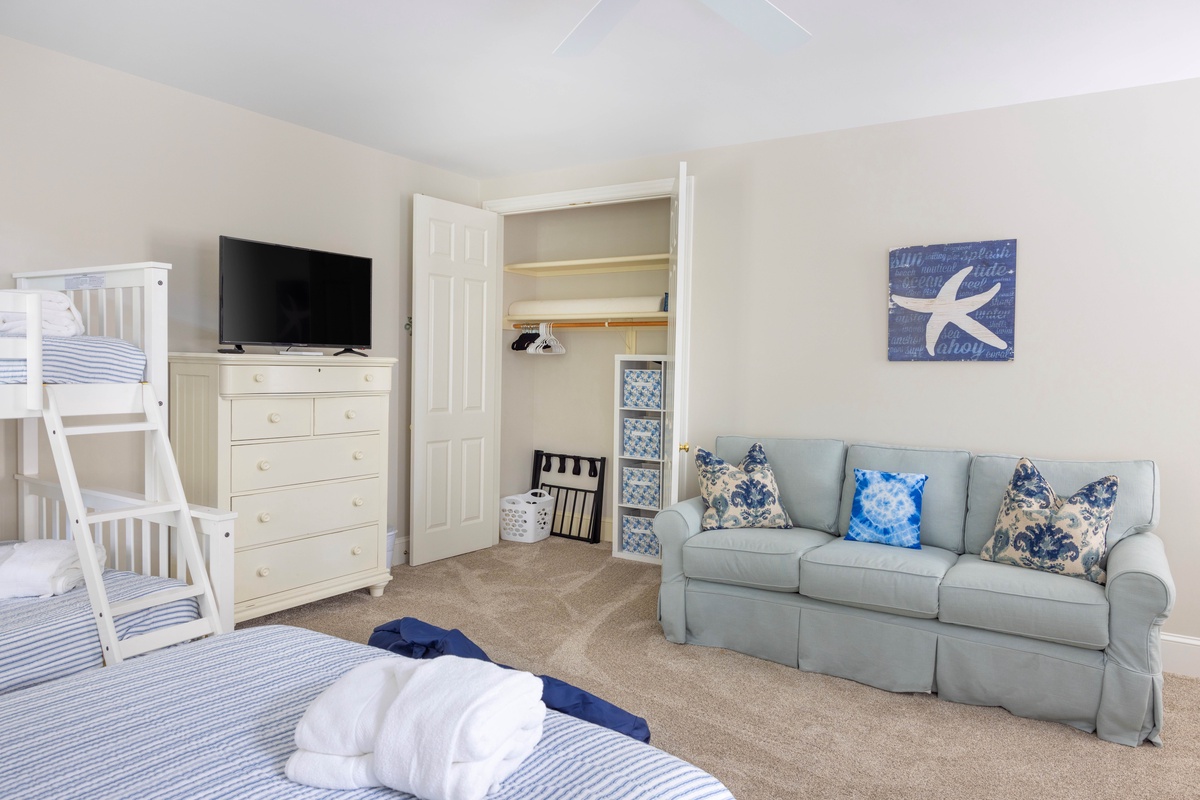 Down the hall and on the same side as the 1st floor primary suite, guests can enjoy an additional bedroom with a queen bed and a daybed. A full-size hall closet, located in between the primary suite and this bedroom, is available for guest use as the entire suite can be closed off from the main living space. Note: this bedroom has access to the half bath on the 1st floor and would share the shower with the 1st floor primary suite.