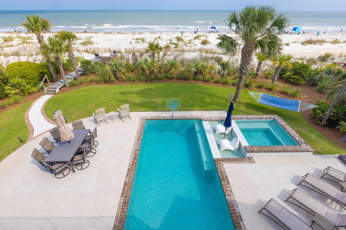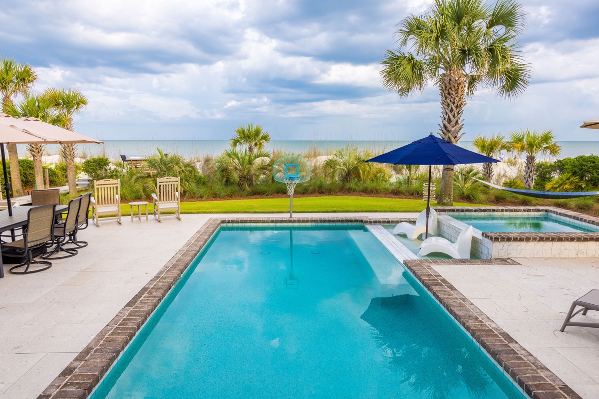 Bask in the rays on the tabby-inlayed sun deck. Unwind in the sparkling spa, watching the waters trickle down past the splash pad into the gorgeous salt water swimming pool. Enjoy an aquatic game of hoops on the built-in net. Beach chairs, games and towels included. And when the sun goes down, watch the stars come out from the wide deck among the dunes on your private boardwalk.