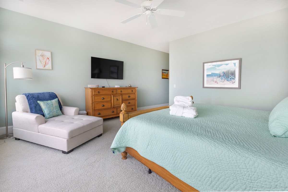 The remainder of the second story is given over to lush guest suites that each put their own spin on oceanfront luxury. In one king suite, you’ll enjoy a private balcony looking out across the dunes. In another, an inspiring panorama of windows imparts stunning elevated ocean views in the space with a king-size bed and upholstered lounge chair. Both enjoy ensuite baths, ceiling fans, and TVS.