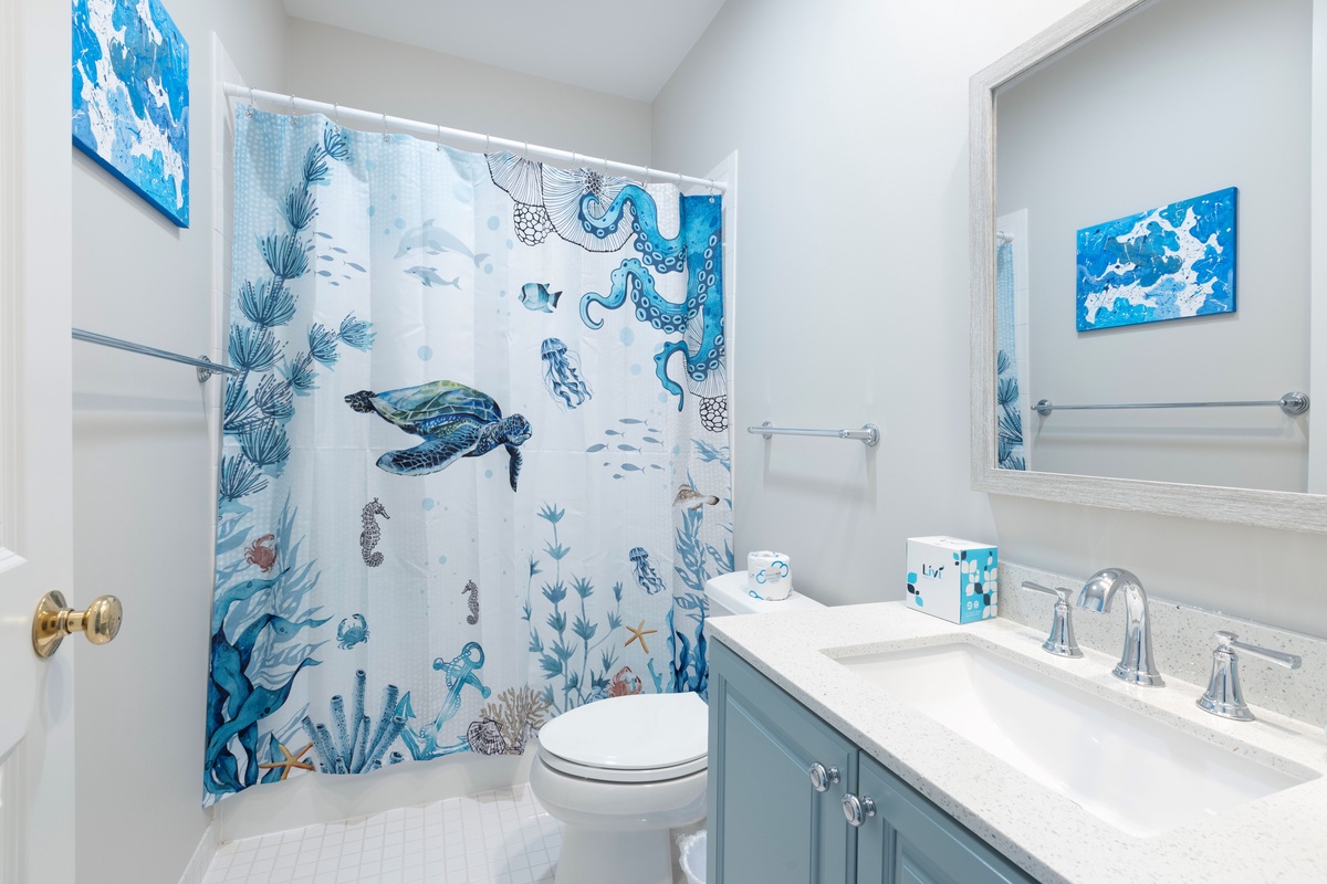 Younger guests will want to claim the massive bunk room on the second-story landing, with its dual twin-over-double bunk beds, separate double bed and sleeper sofa, flat-screen TV, ceiling fan and ensuite bath with tub and shower with handheld to rinse children..