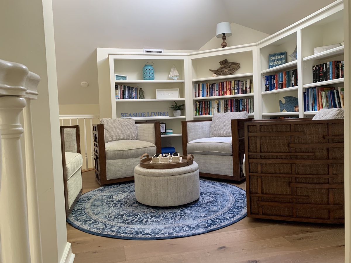 At the heart of the property is the majestic open living space, where soaring vaulted ceilings and plentiful windows flood the room with lush natural light. Here you’ll find the main living area, where two sofas and a chair front a sprawling decorative brick fireplace. Head up the steps and enjoy the elevated views from the loft area with its built-in bookshelves (one of which conceals a surprise crawl space perfect for young explorers).