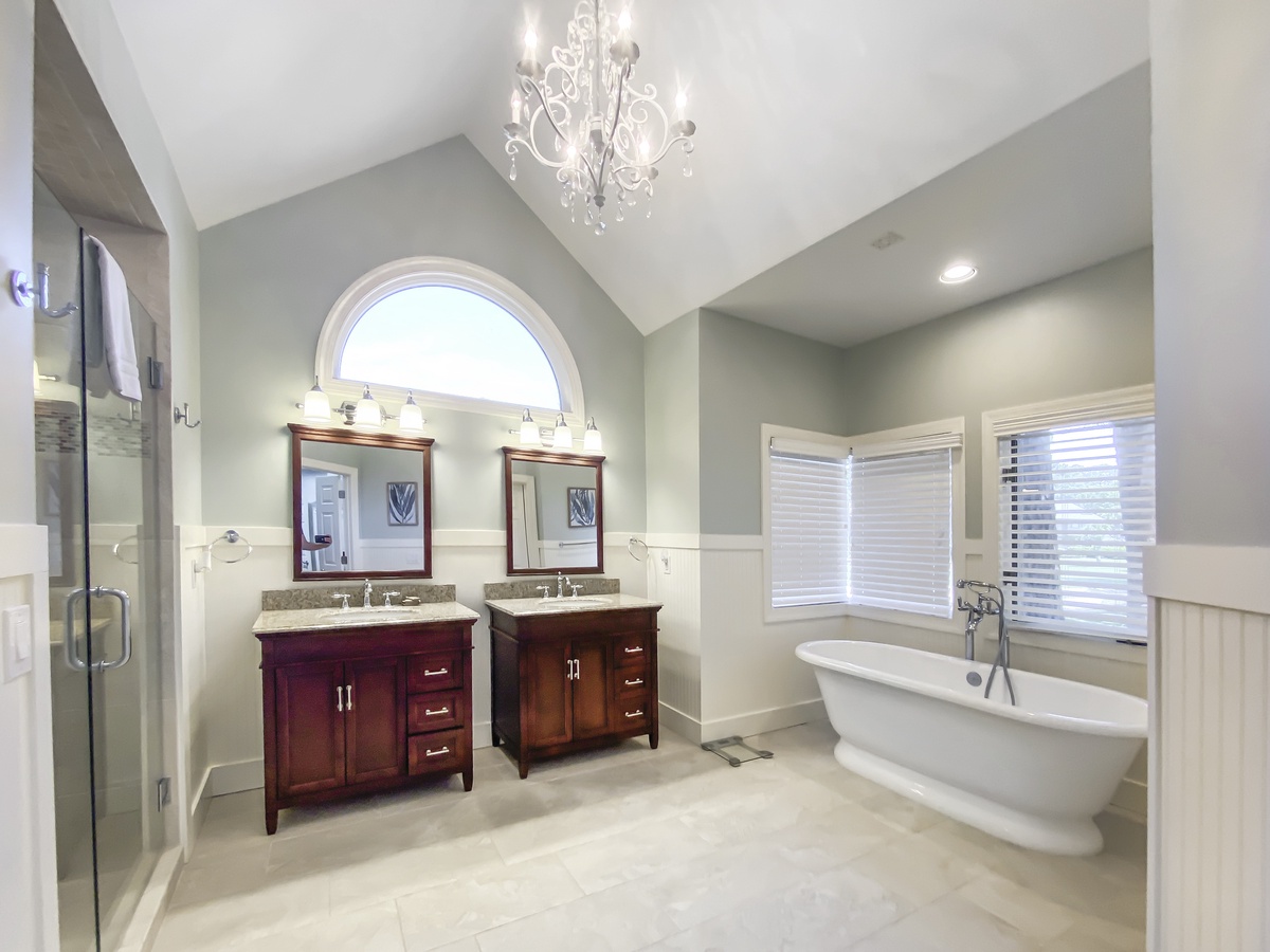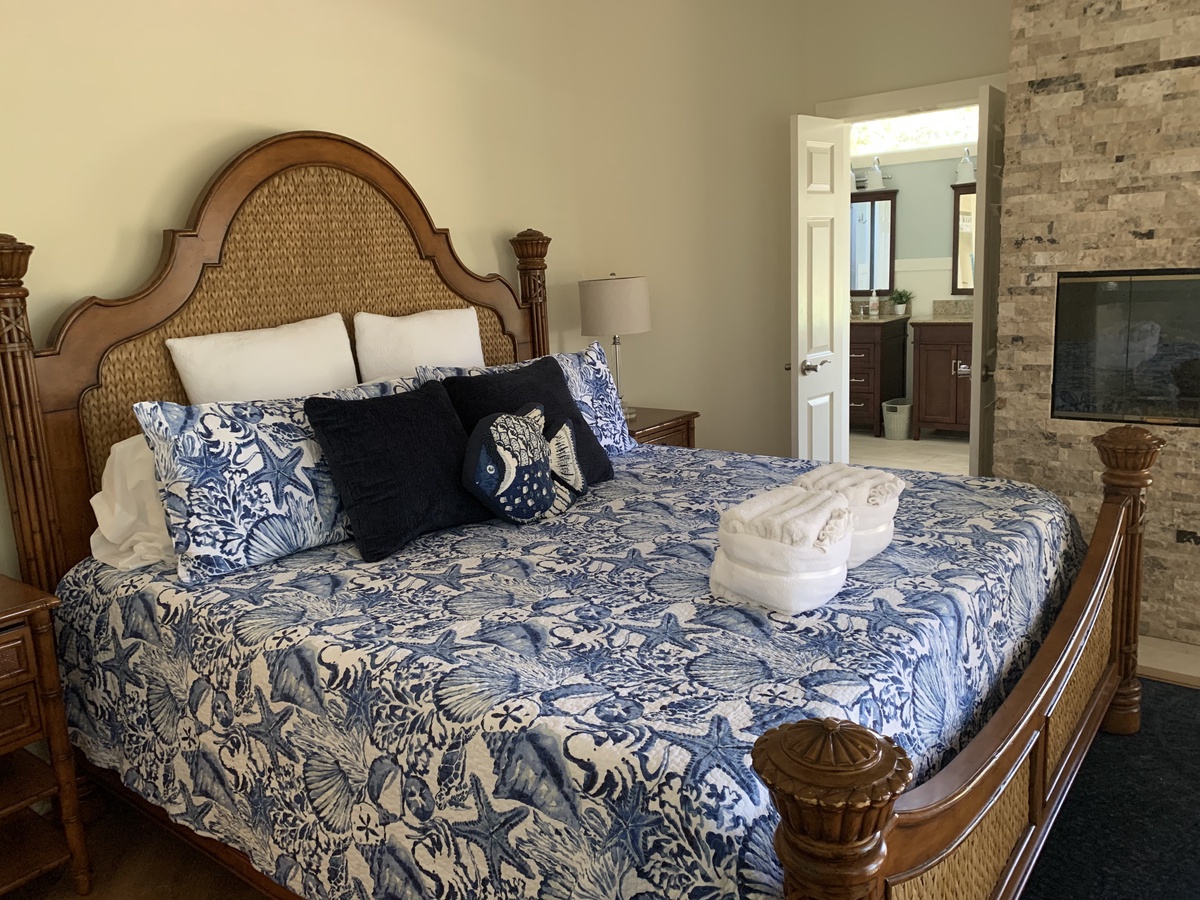Finally, the owners’ suite ups the ante on spaciousness and comfort. Accessible through a cozy den with decorative fireplace and pull-out sofa, this suite enjoys private access to the rear patio and the accompanying golf views. Here you’ll find a king-size bed, decorative fireplace, massive walk-in closet and spa-like en suite with his-and-hers vanities, soaking tub and walk-in shower with dual showerheads.