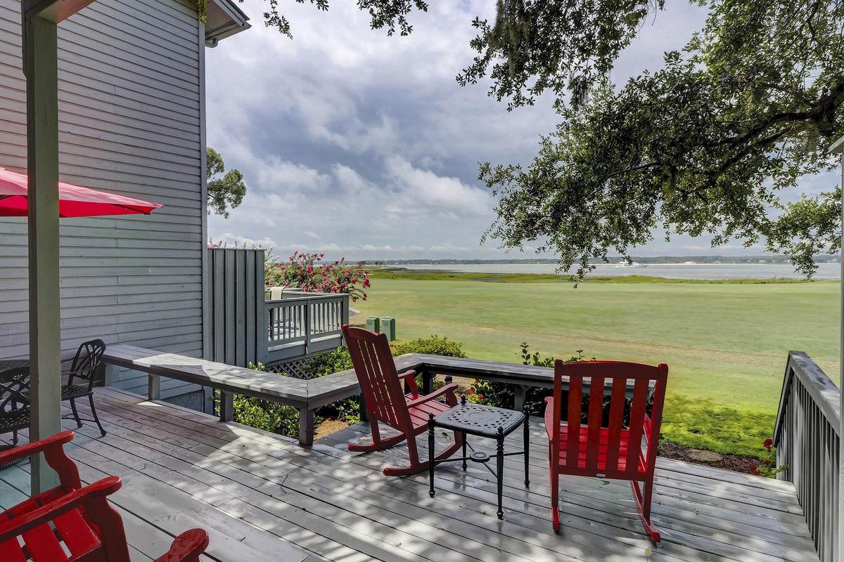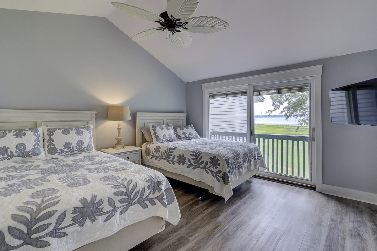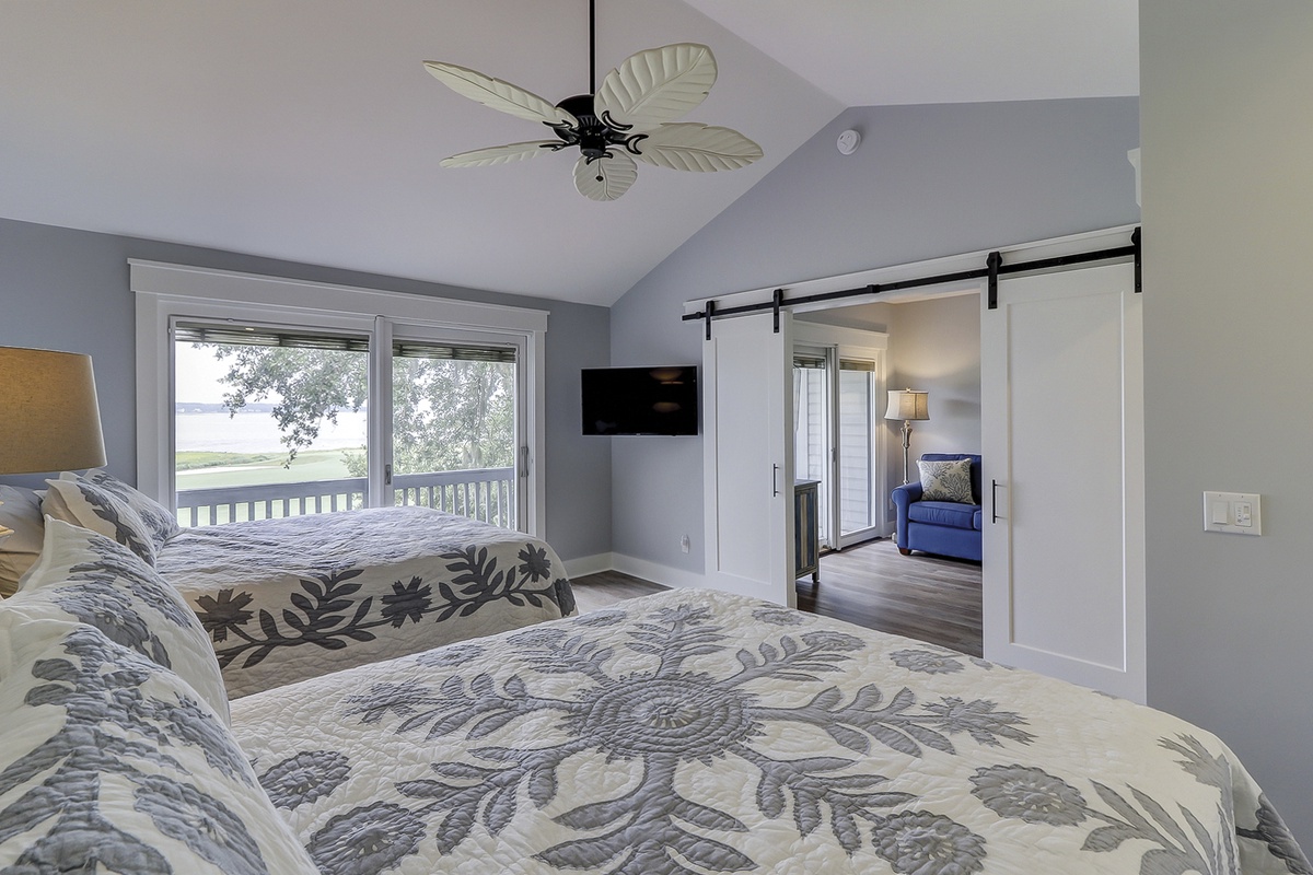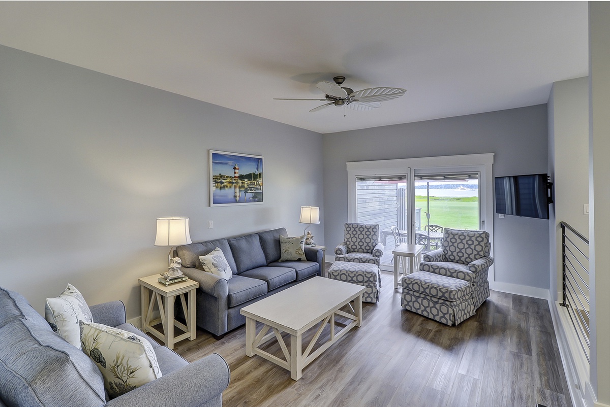 That dramatic view of the fairway and Calibogue Sound beyond floods this open floorplan with blissful natural light. You’ll see it from the updated kitchen, with its quartz counters and state-of-the-art appliances; from the sophisticated formal dining room with farmhouse style table offering seating for six; and from the sunken living room with sleeper sofa, loveseat, armchairs and massive flat-screen TV.