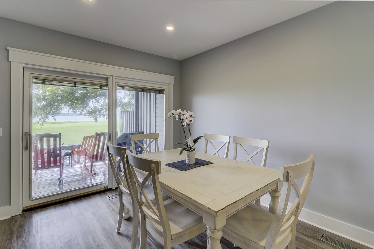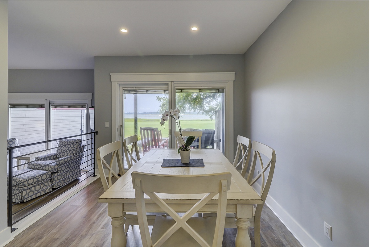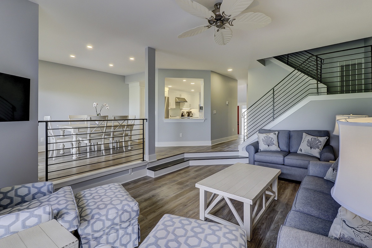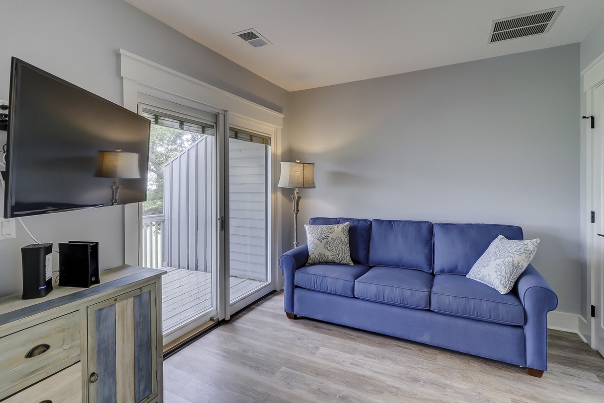 That dramatic view of the fairway and Calibogue Sound beyond floods this open floorplan with blissful natural light. You’ll see it from the updated kitchen, with its quartz counters and state-of-the-art appliances; from the sophisticated formal dining room with farmhouse style table offering seating for six; and from the sunken living room with sleeper sofa, loveseat, armchairs and massive flat-screen TV.