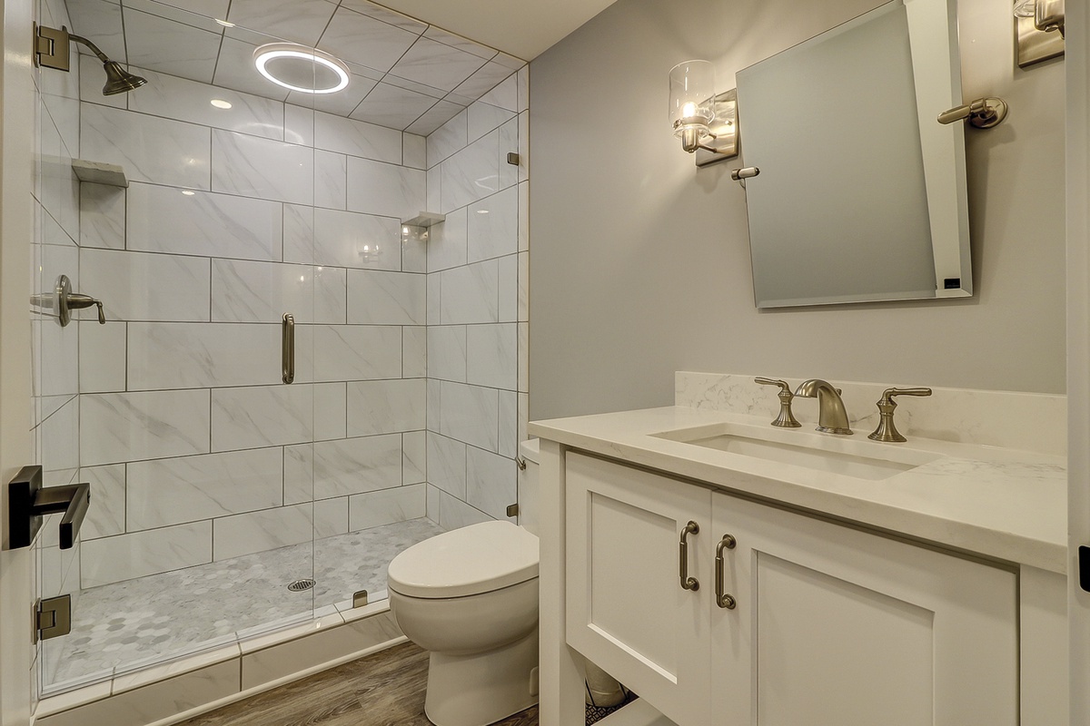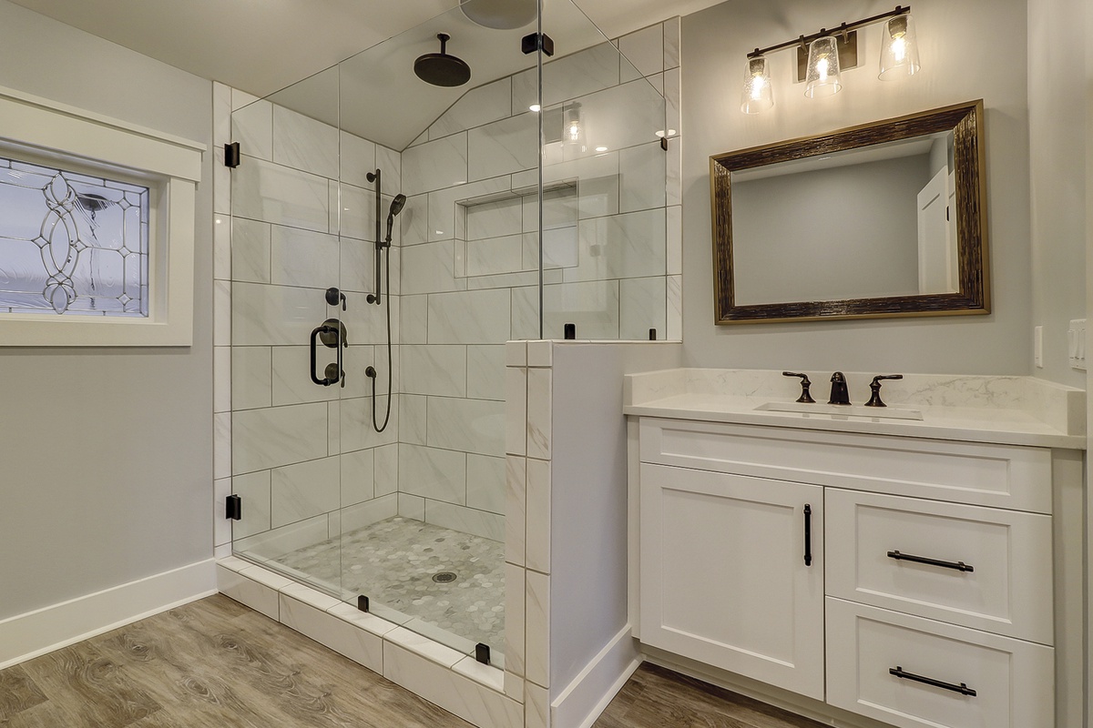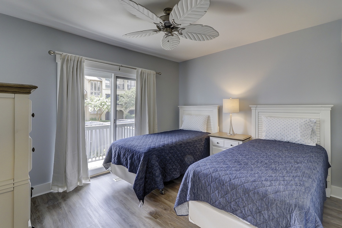 The remaining guest rooms are found on the second floor, with the first set just beyond a catwalk overlooking the front foyer. Here two twin beds face a flat-screen TV and a set of sliders out to a private balcony. The en suite exudes comfort with its expansive walk-in shower boasting rainfall showerhead.