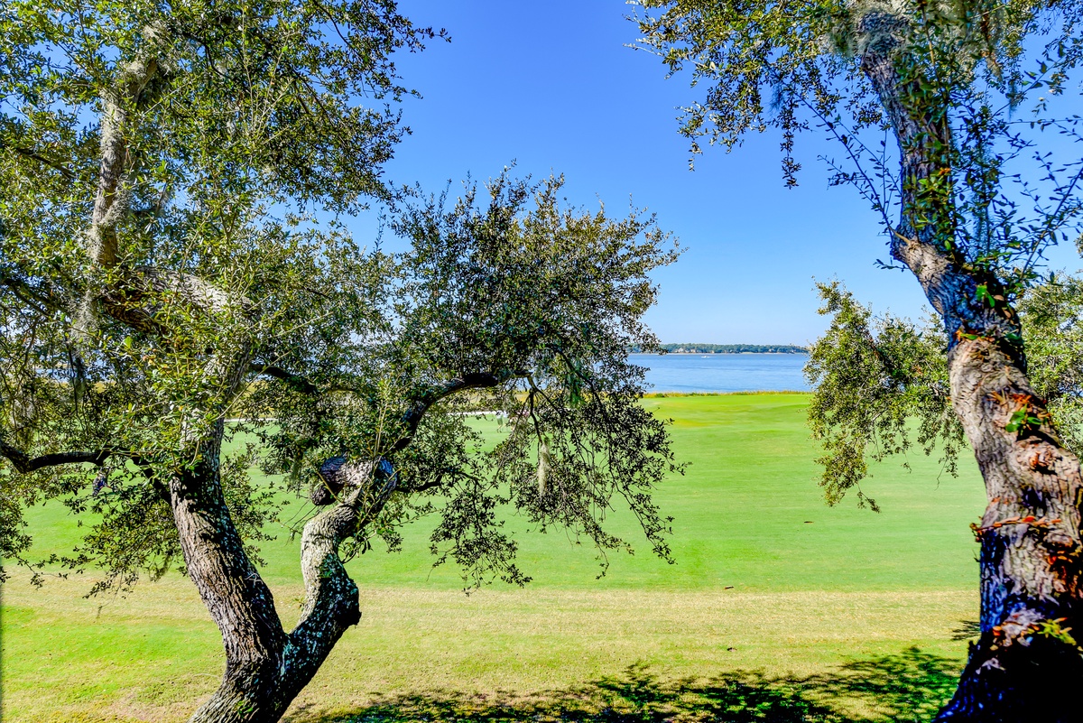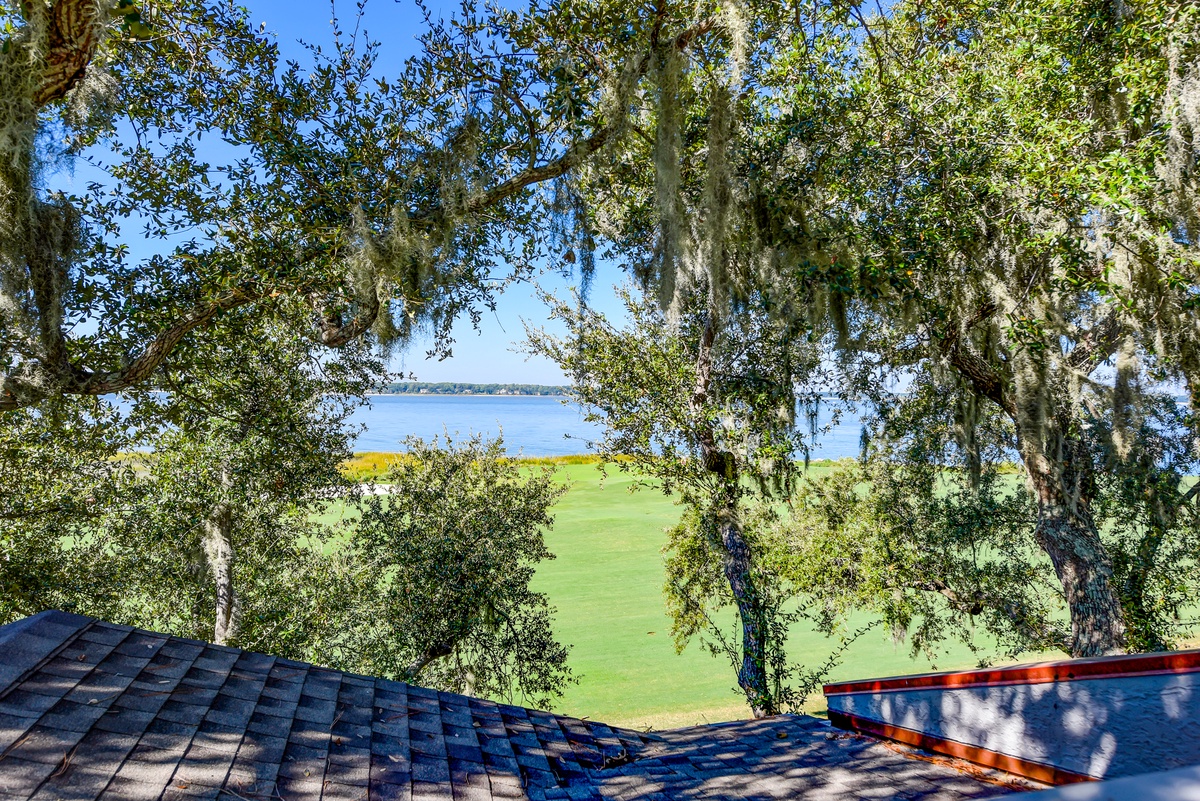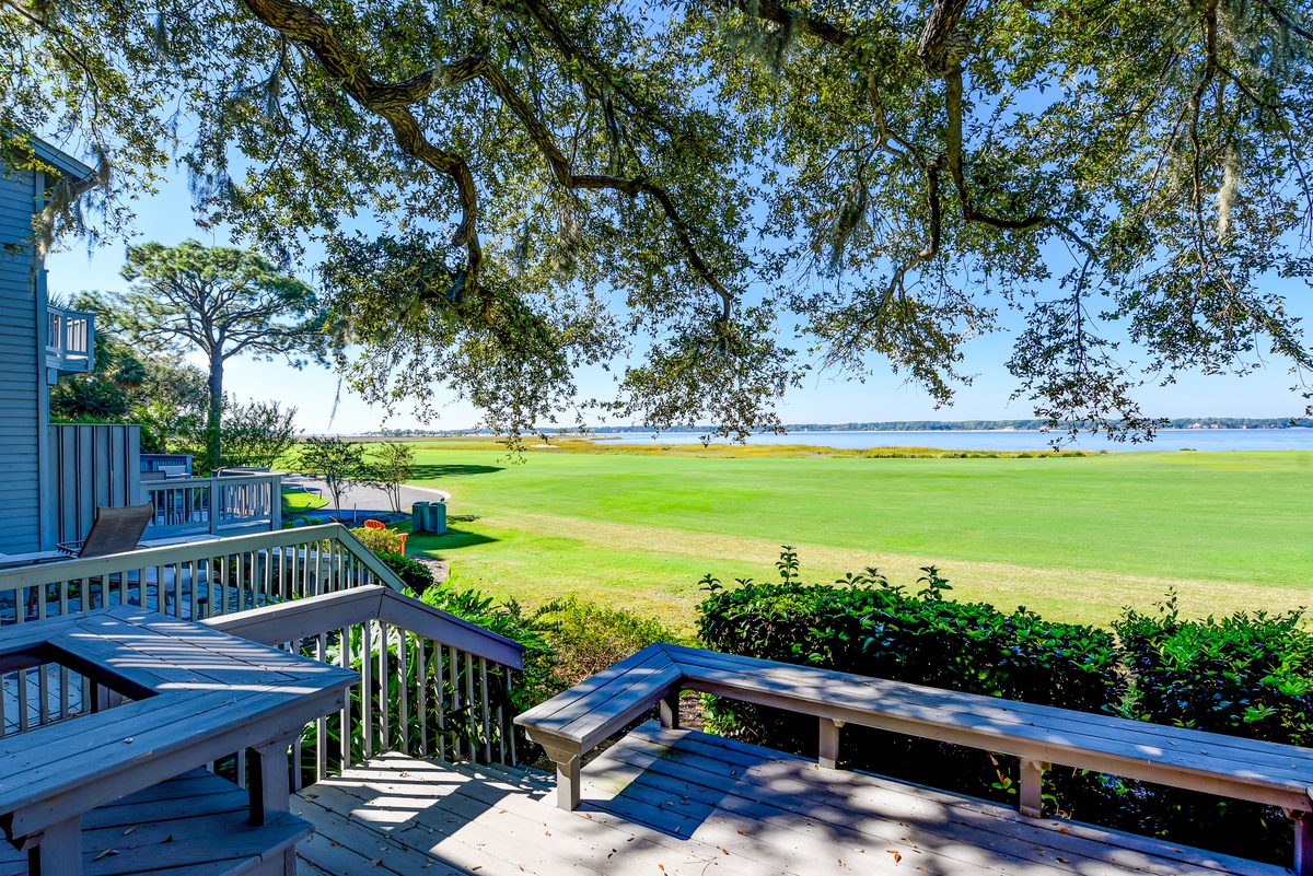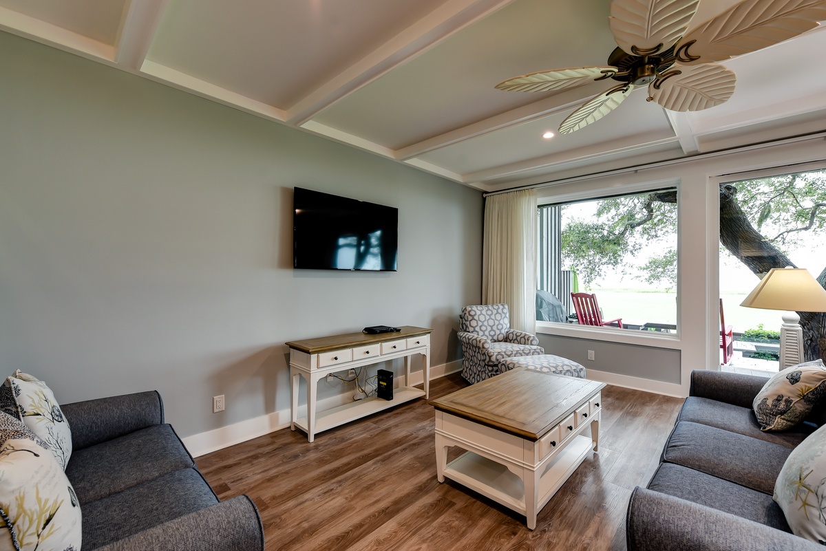 Just beyond that you’ll find dining with a view at a wide two-table with seating for eight, plus stylish comfort amid a great room with plentiful seating before a wide flat-screen TV. Filling this space with lush natural light is a wall of windows and a sliding glass door that take you out to the edge of the 18th fairway. Notable for the live oak growing right up through the center, the outdoor deck revels in scenery and the light breezes off the sound.