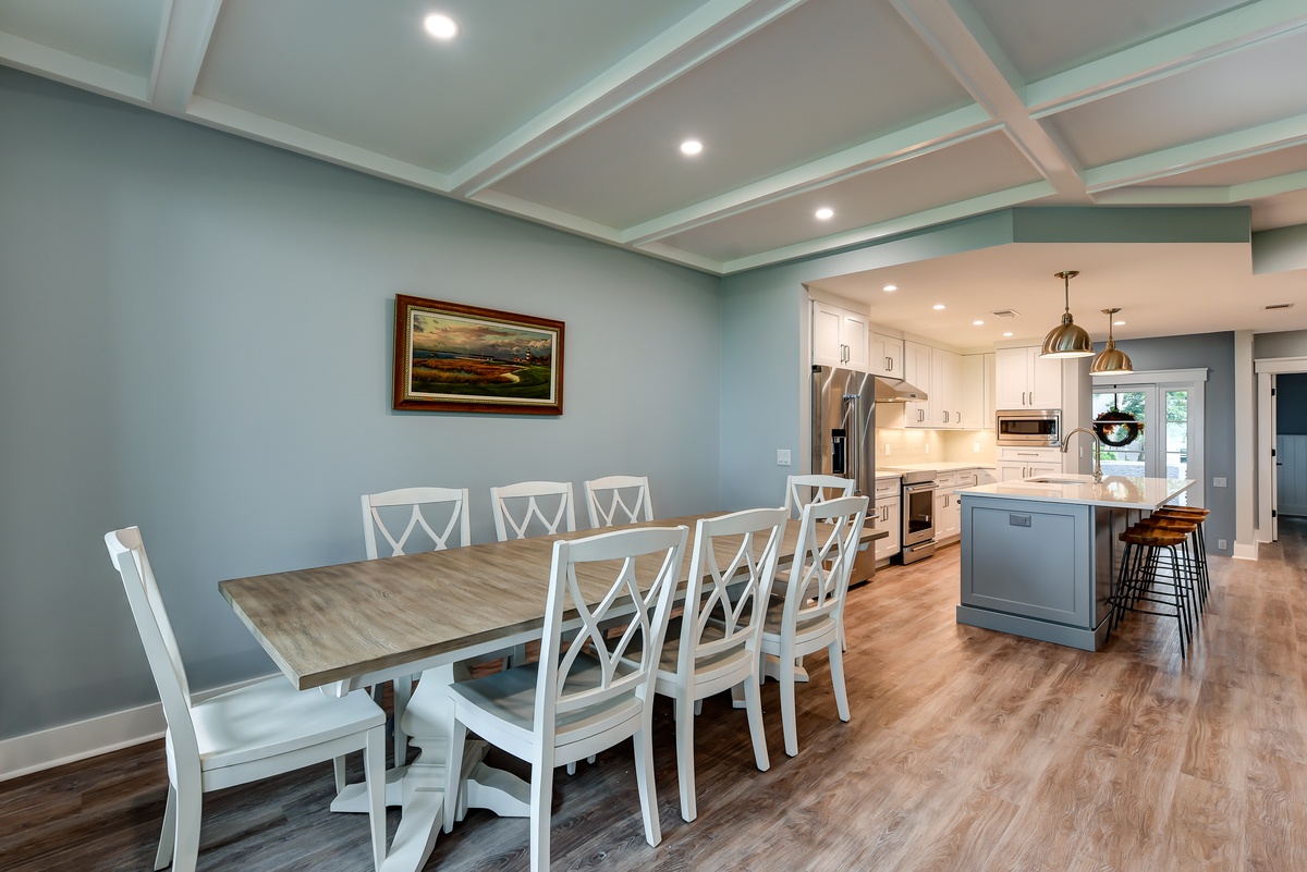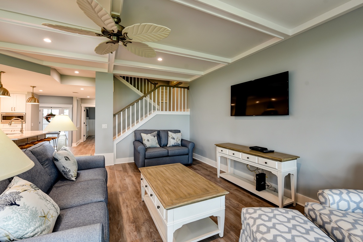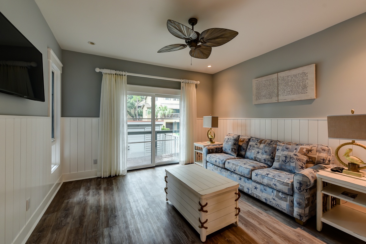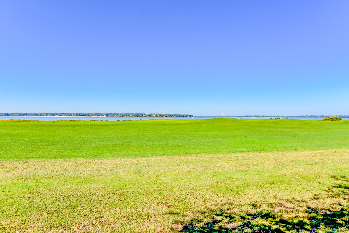 Just beyond that you’ll find dining with a view at a wide two-table with seating for eight, plus stylish comfort amid a great room with plentiful seating before a wide flat-screen TV. Filling this space with lush natural light is a wall of windows and a sliding glass door that take you out to the edge of the 18th fairway. Notable for the live oak growing right up through the center, the outdoor deck revels in scenery and the light breezes off the sound.