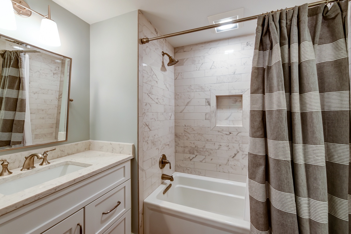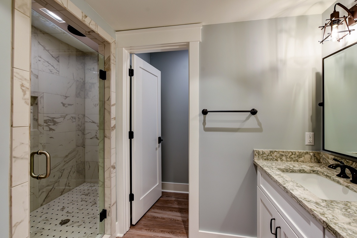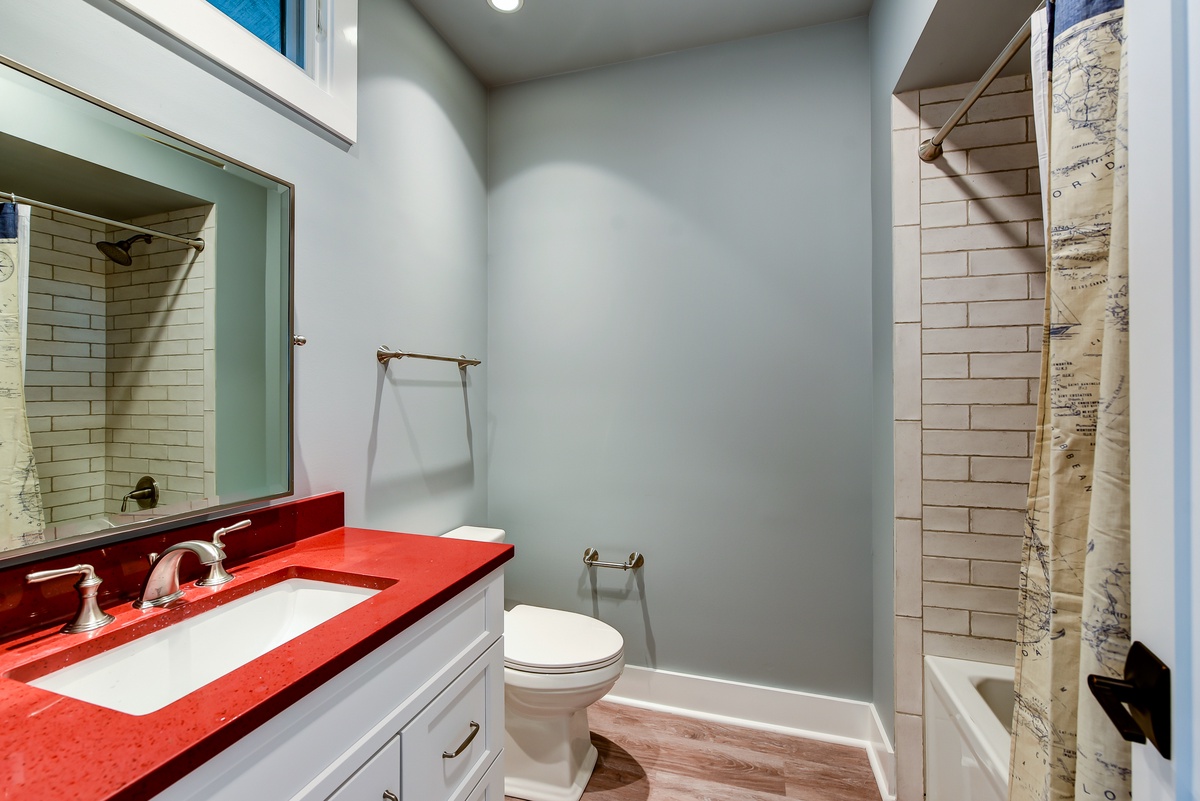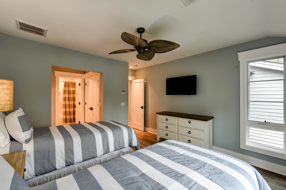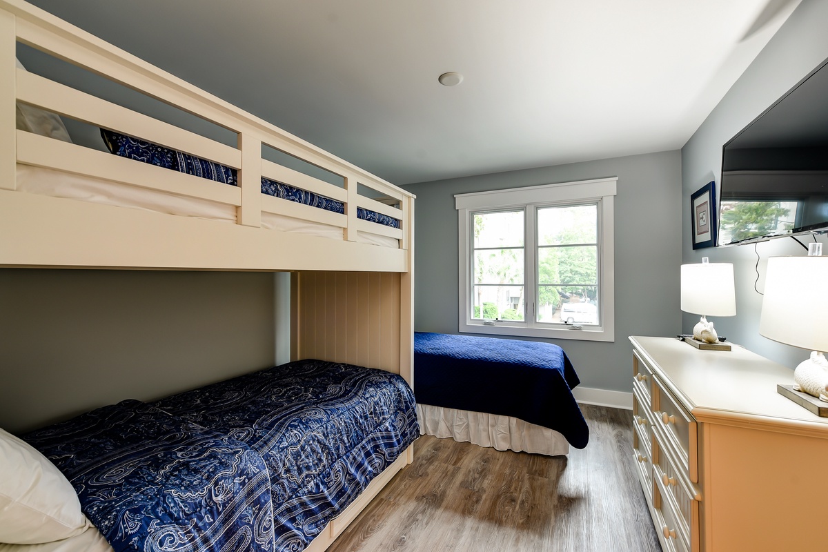 The remaining guest rooms can be found up a two-tone staircase whose elegant millwork echoes the refreshed look found throughout the property. In the first, we find dual twin beds set before a flat-screen TV in a space with ceiling fan, private courtyard entrance set beyond sliders, and an en suite with tub and shower. Another serves as the ideal spot for younger guests, with its bunk bed, additional twin bed, flat-screen TV and en suite with tub and shower.
