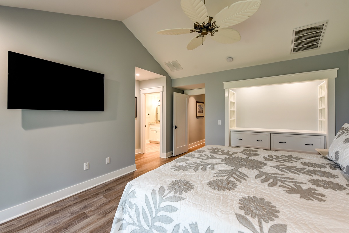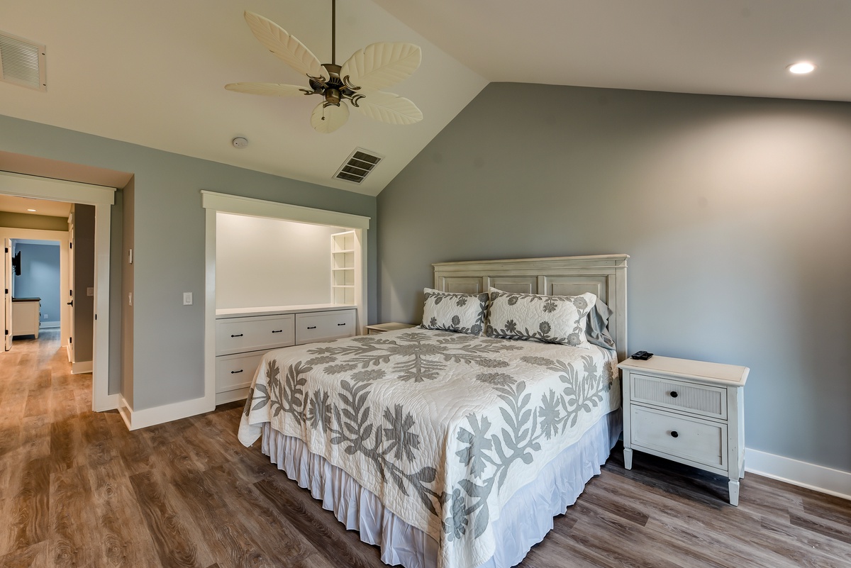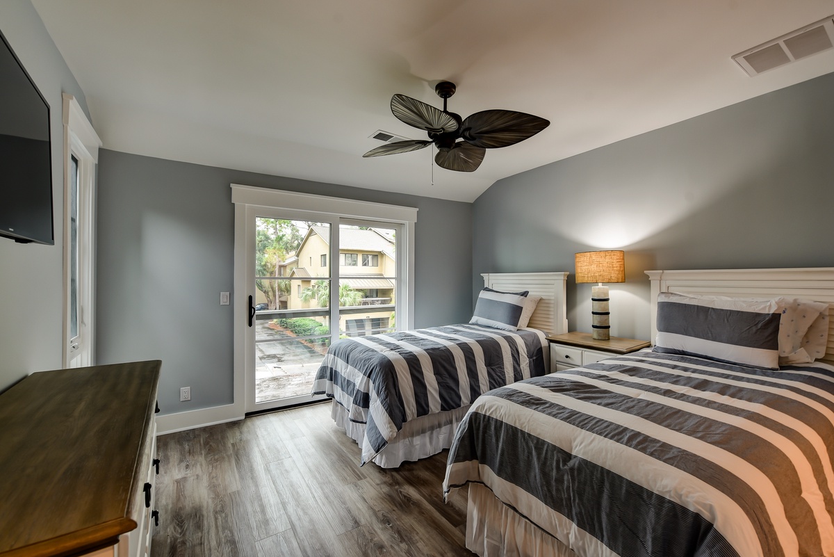 The final guest room on this floor serves as an elegant master suite, offering a king-size bed set amid luxurious amenities like a wide-blade ceiling fan, private balcony overlooking Calibogue Sound and spacious en suite with a cavernous walk-in shower.