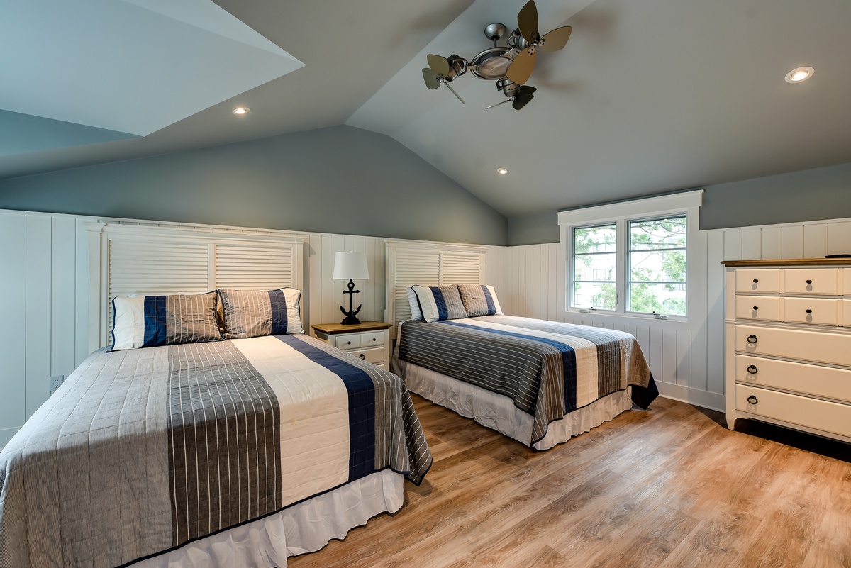 The top floor of this villa is dedicated to a spacious guest room boasting two queen beds set beneath soaring vaulted ceilings. Enjoying eye-catching wainscoting, large ceiling fan and flat-screen TV, this suite offers a private rooftop patio and large en suite with tub and shower.