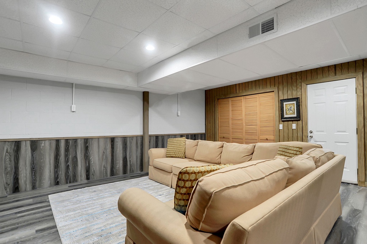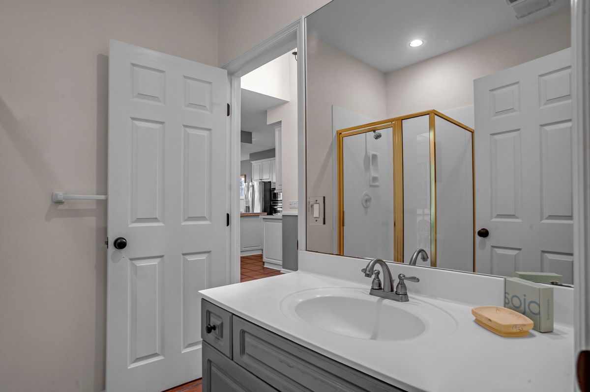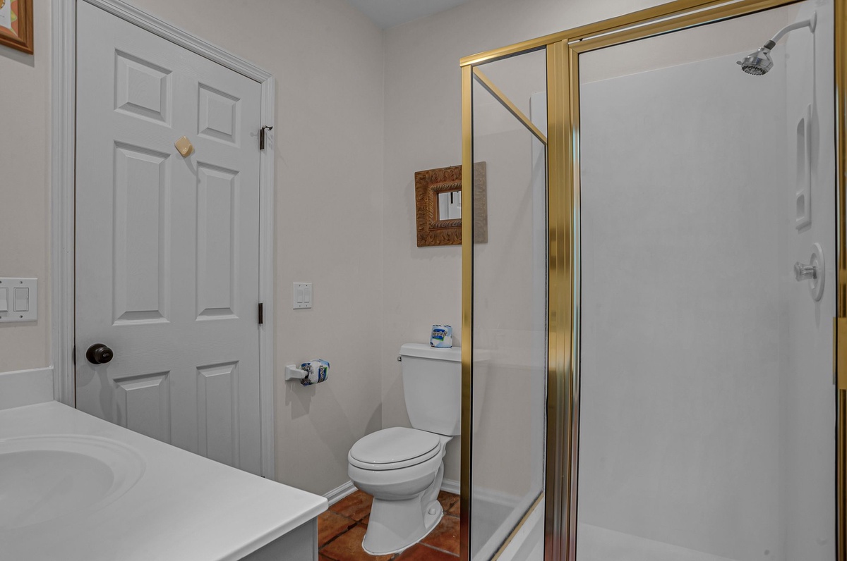 Double doors lead to the first floor’s nautically-inspired bedroom, decorated with crisp blue and white, featuring two queen beds, a TV, an expansive walk-in closet, and an adjacent bath with shower.
