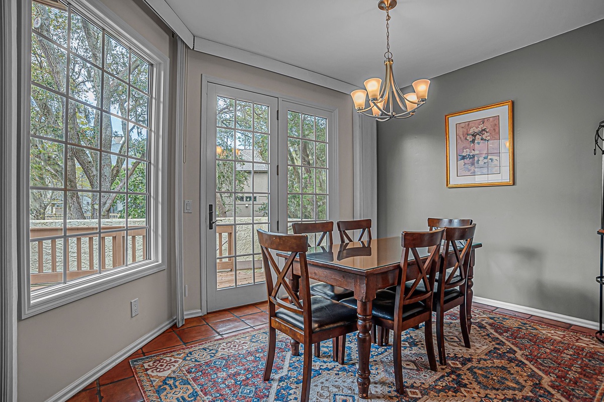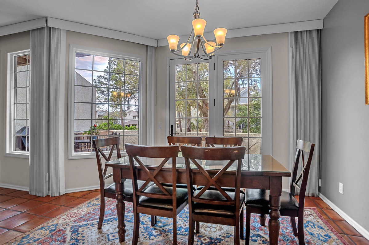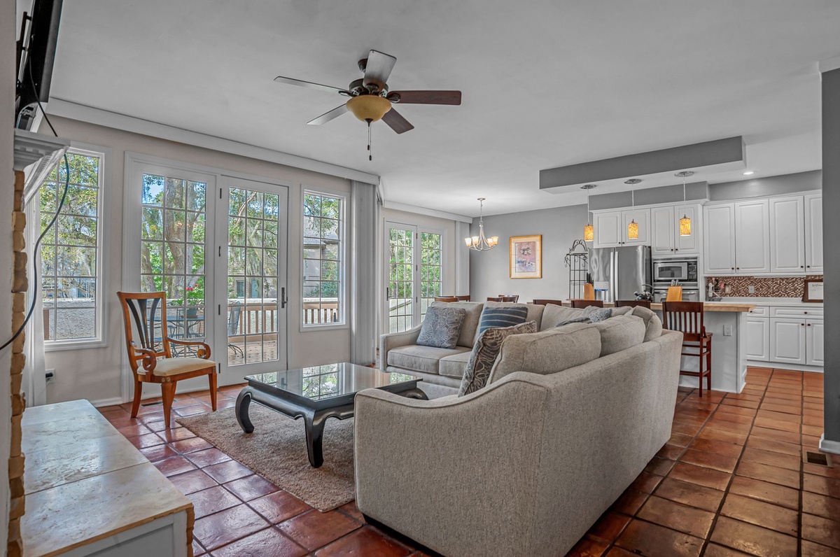 This main living/kitchen area has generous seating, a TV and DVD player. The room opens to the private deck outside through glass French doors, with a wooded and partial golf course view, literally steps from Harbour Town Golf Links.