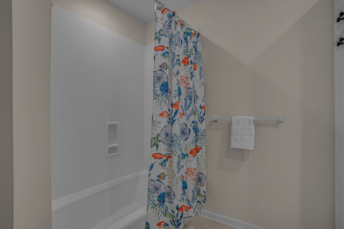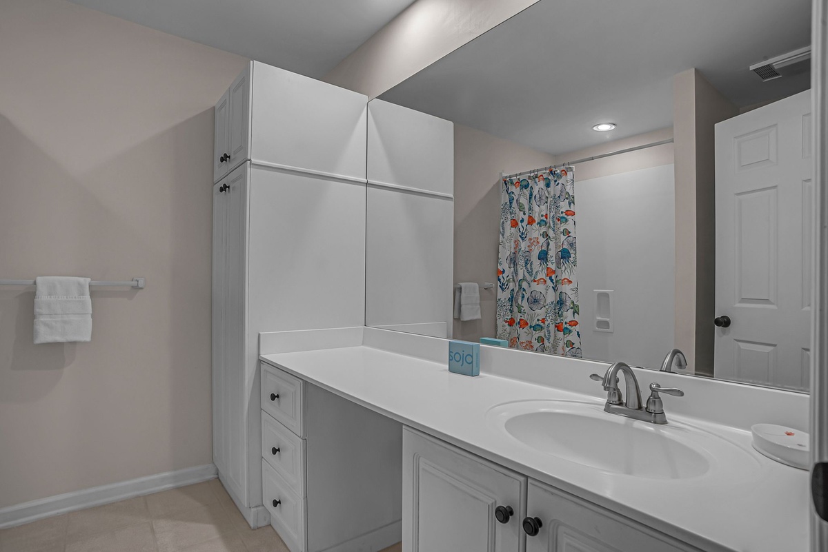 The second floor features a privately-situated master suite of grand proportions and neutral tones, including its own living area with a king-sized bed, plus a private covered balcony with seating, a large walk-in closet, and a roomy master bath with sunken whirlpool and a double-sink vanity. Then the third bedroom, also on the second floor, features a soothing palate of cream and pale green. With a queen-sized bed, ceiling fan, TV, private bath with tub and shower, this room makes for lovely accommodations for a couple….or a couple of kids!