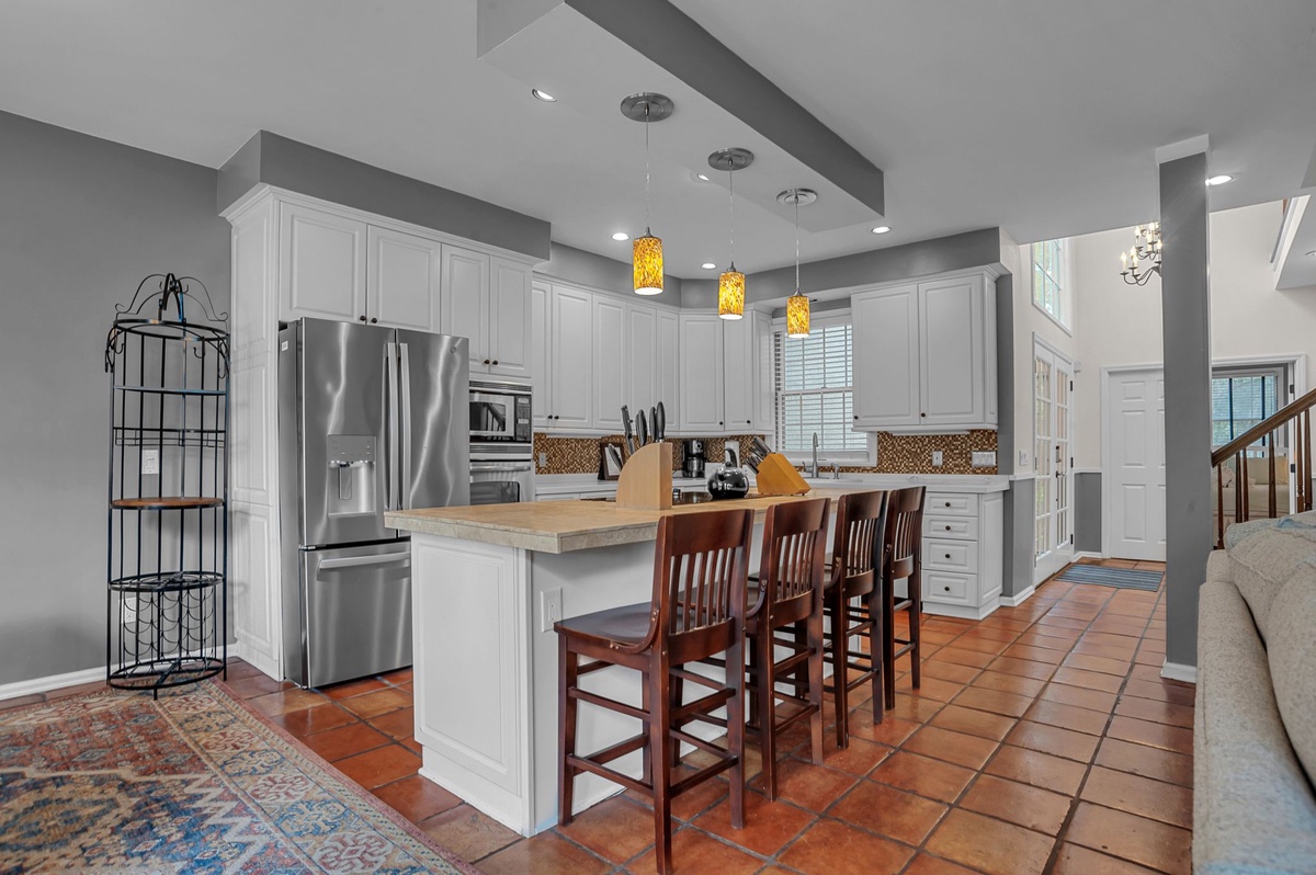 Beyond its courtyard and wide tabby stairs is the high-ceilinged front entry, which opens to terracotta tile flooring, and an inviting combination living space with eat-in kitchen, all in serene hues of cream and muted sage-green. The kitchen could easily serve ten four at the kitchen counter/bar, and six at the dining table.