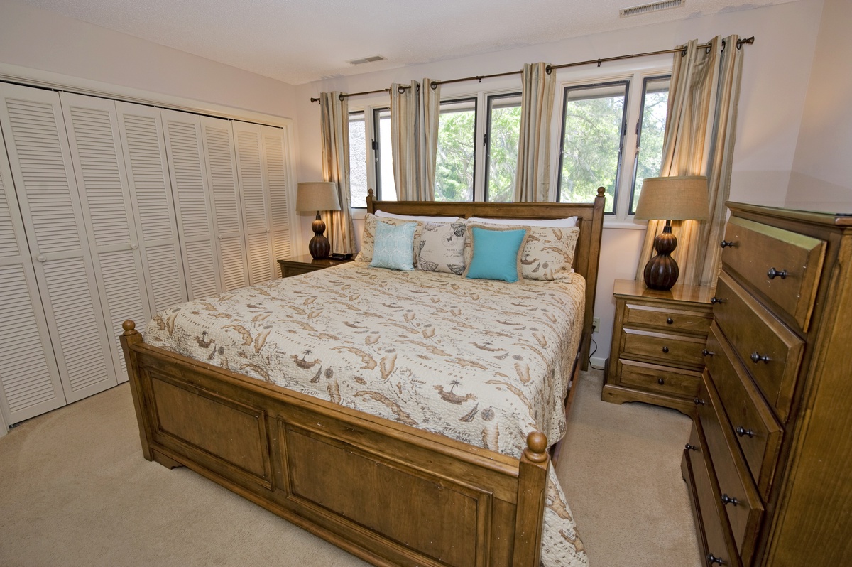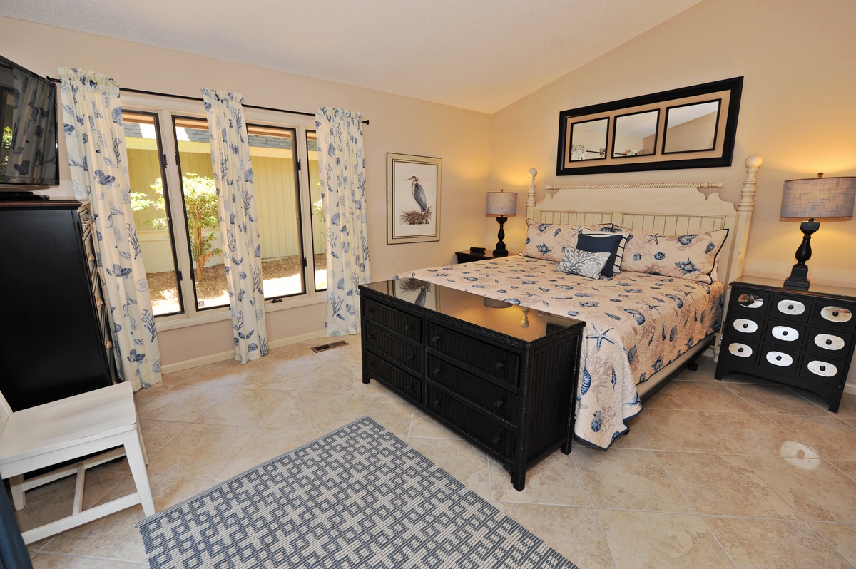 The first floor king master bedroom is decorated in serene blue & sand coastal décor. It features a flat screen TV and sliding glass doors to the deck. Enjoy a leisurely breakfast or afternoon cocktail here with breathtaking views of abundant Lowcountry wildlife. The master bath has granite countertops, 2 sinks and a glass enclosed shower tub.