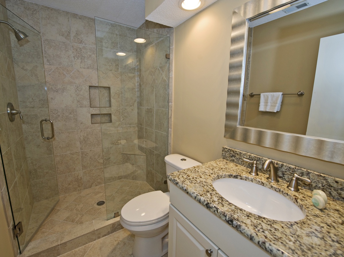 Upstairs you will find two additional lovely bedrooms. Another king master bedroom with an en suite bath featuring a granite counter vanity & glassed walk-in shower. Two twin beds adorn the third bedroom as well as a flat screen TV and a quaint table & chairs. The private bath has a granite counter and glassed walk-in shower. Both upstairs bedrooms have views the pool & lagoon.