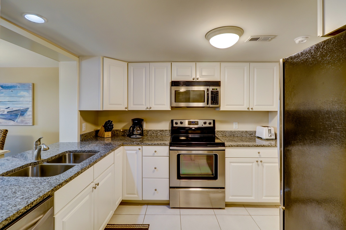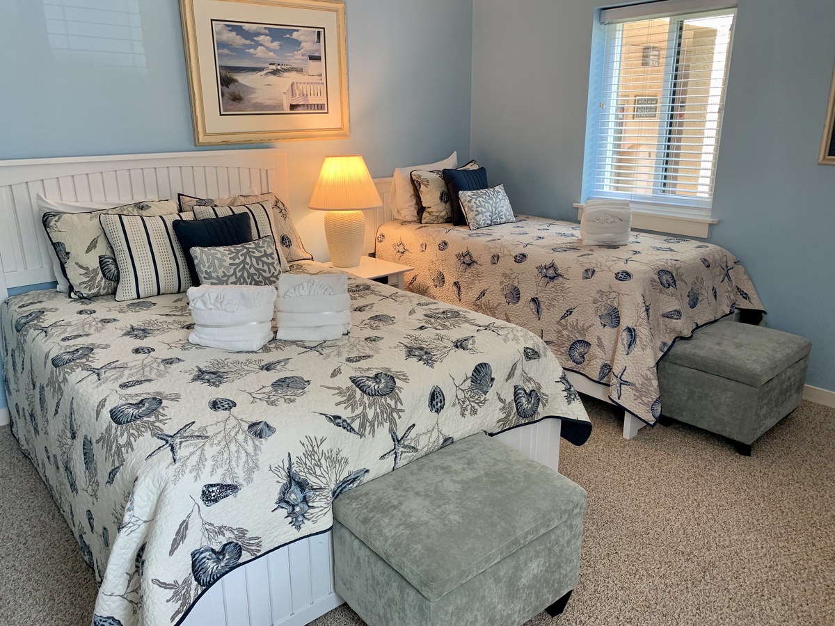 With a subtly beach motif in tones of blue sand and sea, the second bedroom holds one queen and one xl twin bed and a flat screen TV. It also has a private bath with granite countertops, a sleek dark-toned vanity and a tub/shower combination.