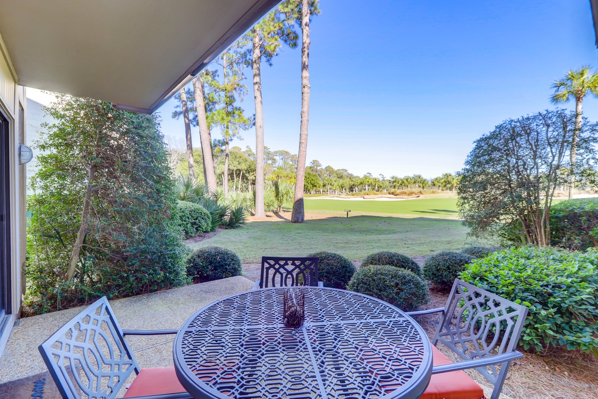 From the living room, sliding glass doors open to a pebbled patio with a table for four, overlooking the 9th hole of the Ocean Course.