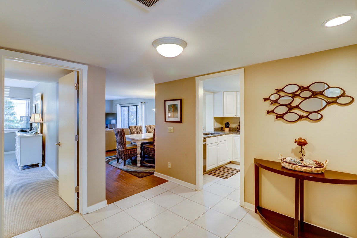 Porcelain floors grace the stylish and chic living room, soothing in a neutral palate with Atlantic-blue accents. The room also offers a queen-sized sleeper sofa, large flat screen TV.