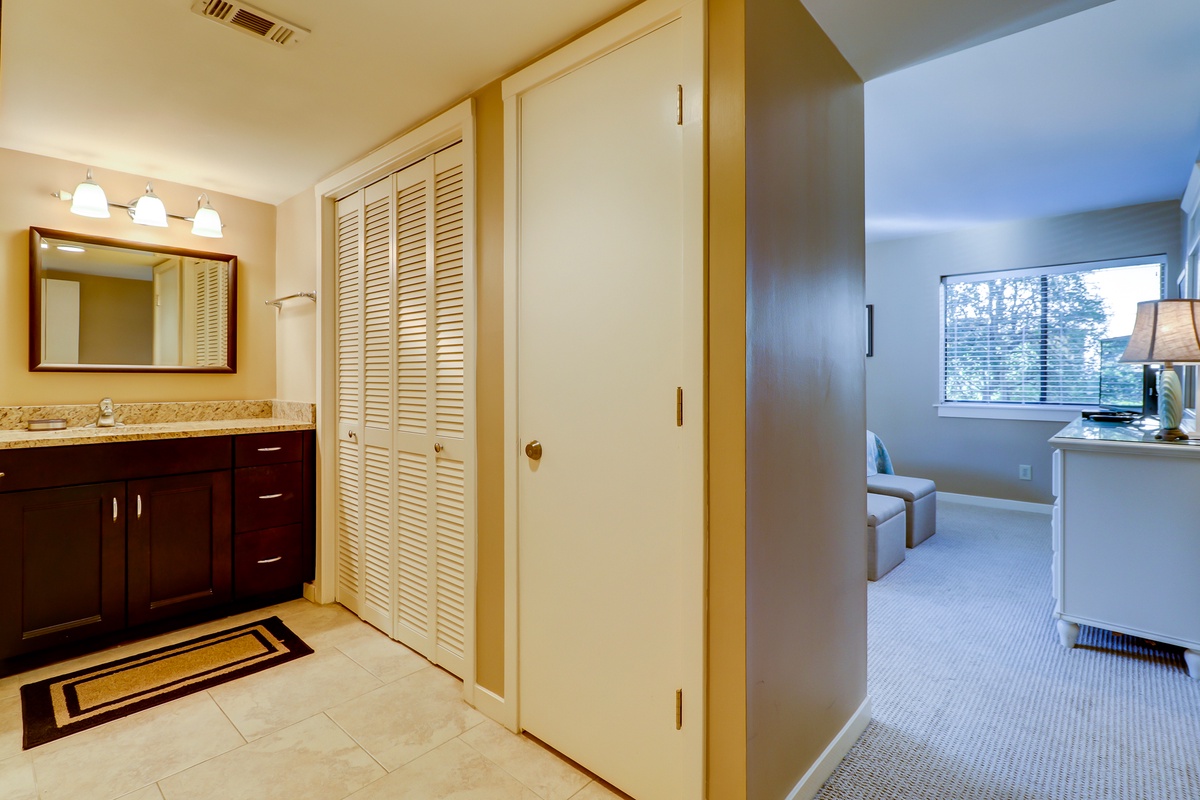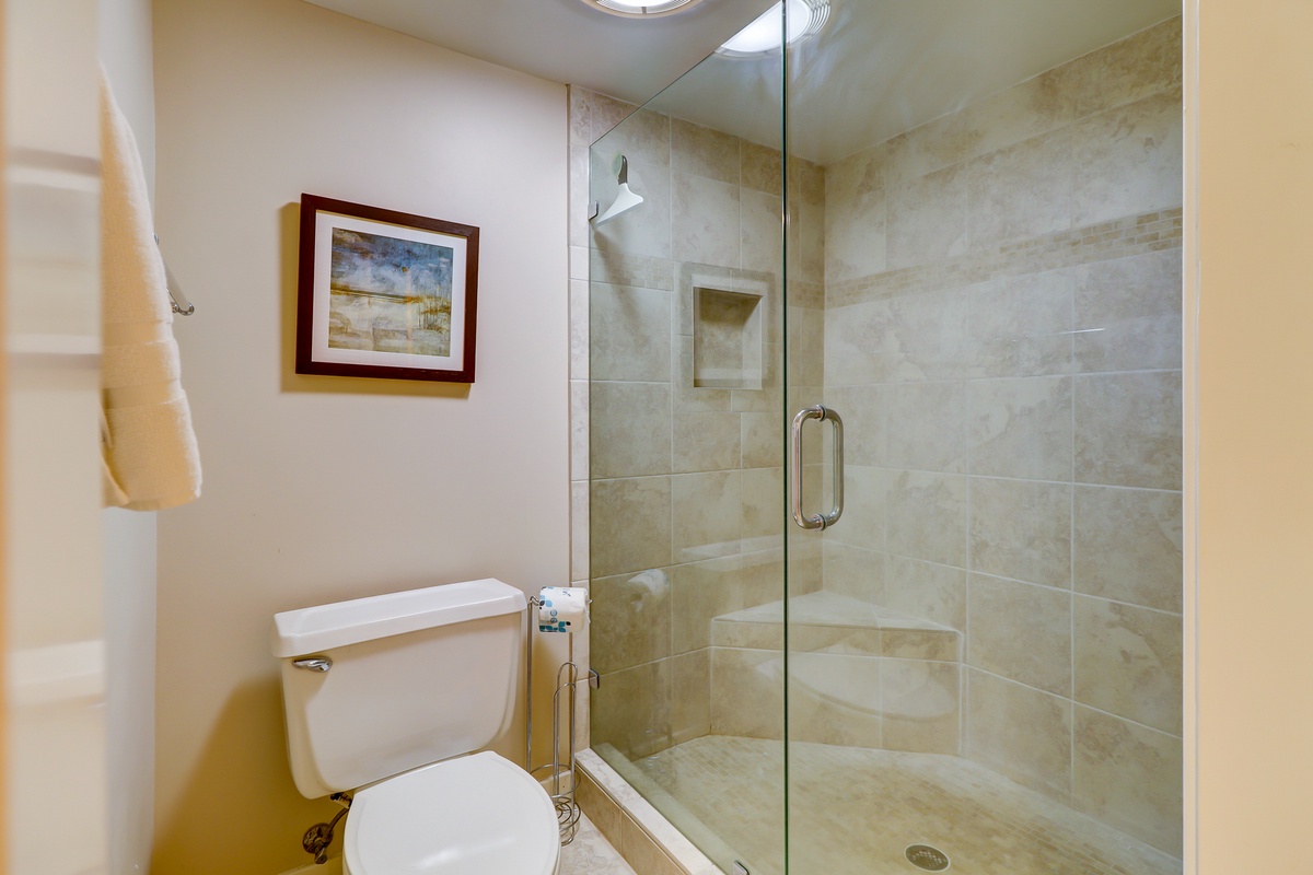 The peacefully decorated master bedroom showcases bead-board furnishings including a king-sized bed, as well as a 32” flat screen TV. The lovely master bath has dark wood vanity topped with tan and taupe granite, plus a custom built oversize walk-in tile shower with glass doors.