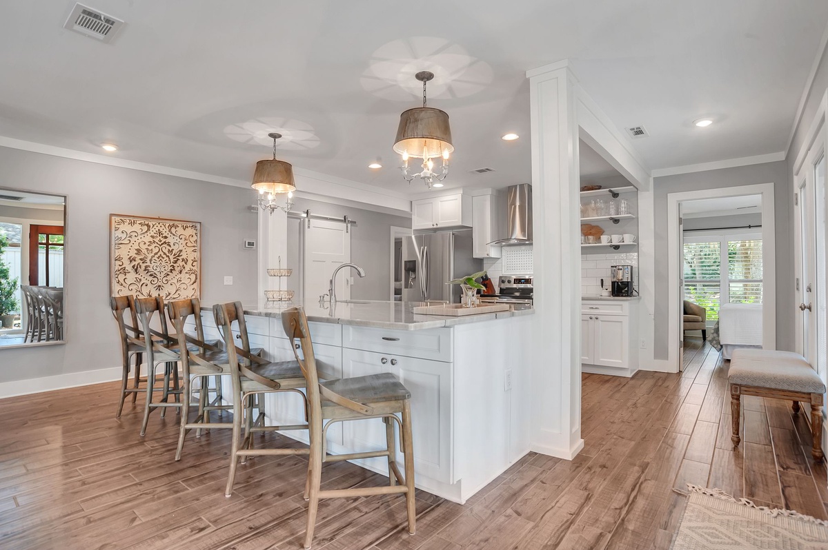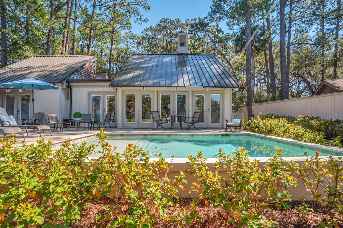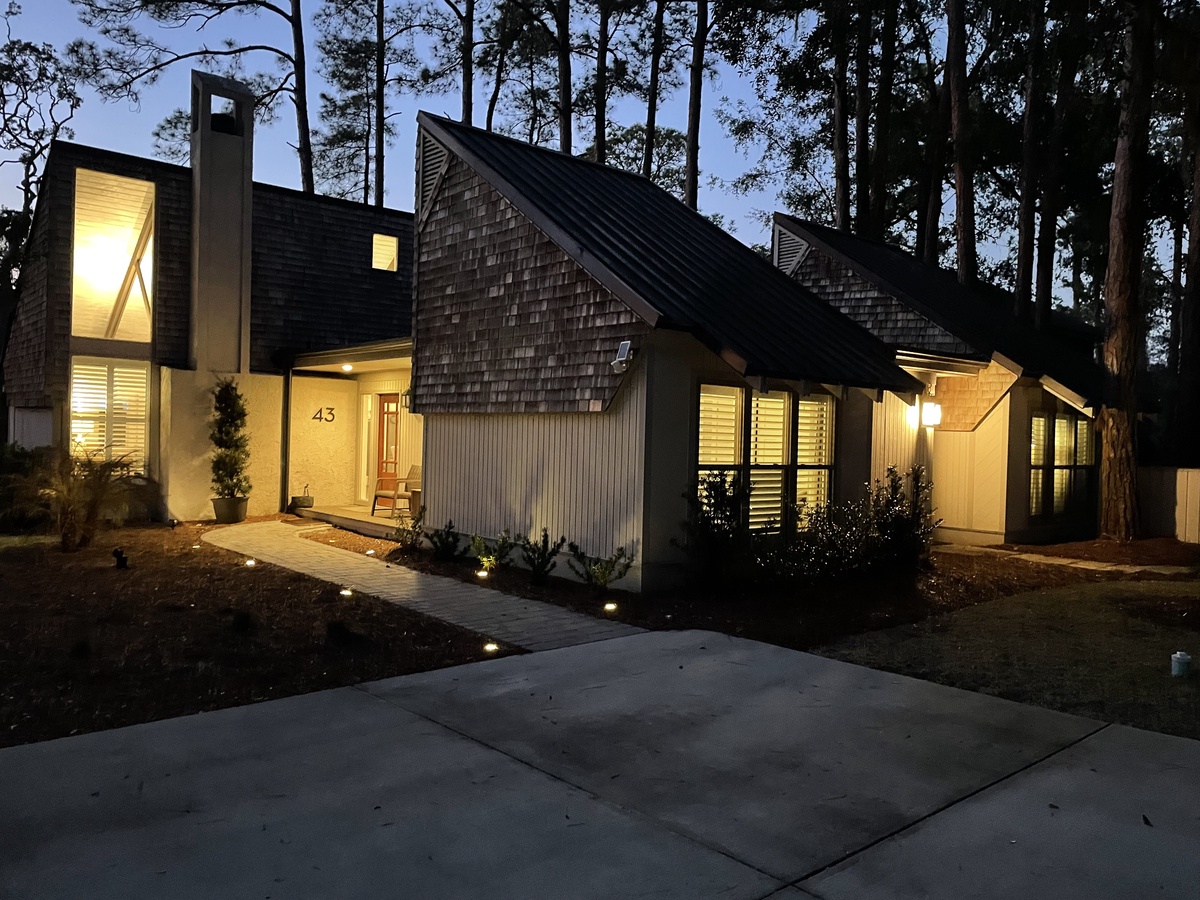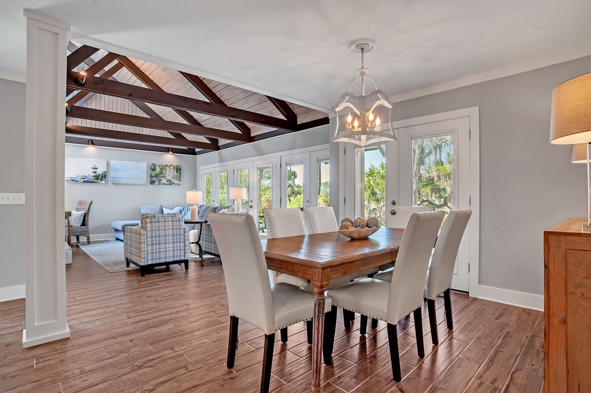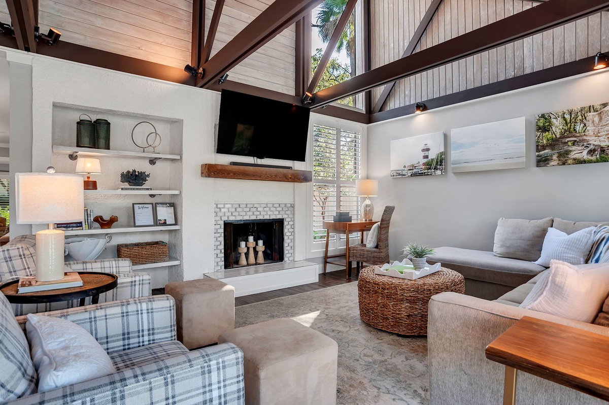Presenting from the outside as a beautiful example of classical Sea Pines architecture, the interior of this lushly private vacation oasis has been thoroughly updated to reflect modern coastal flair.