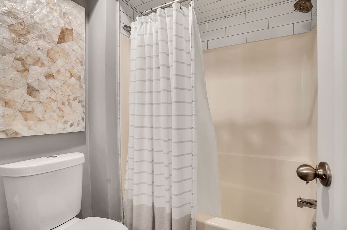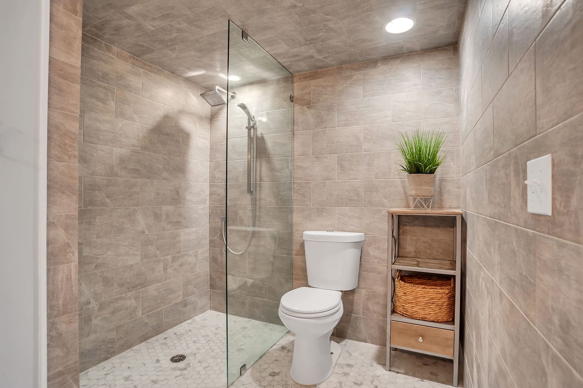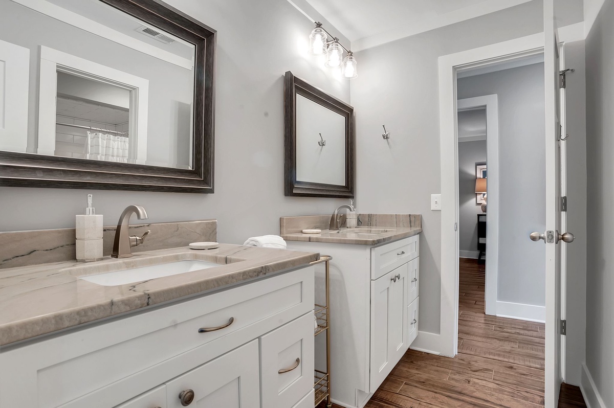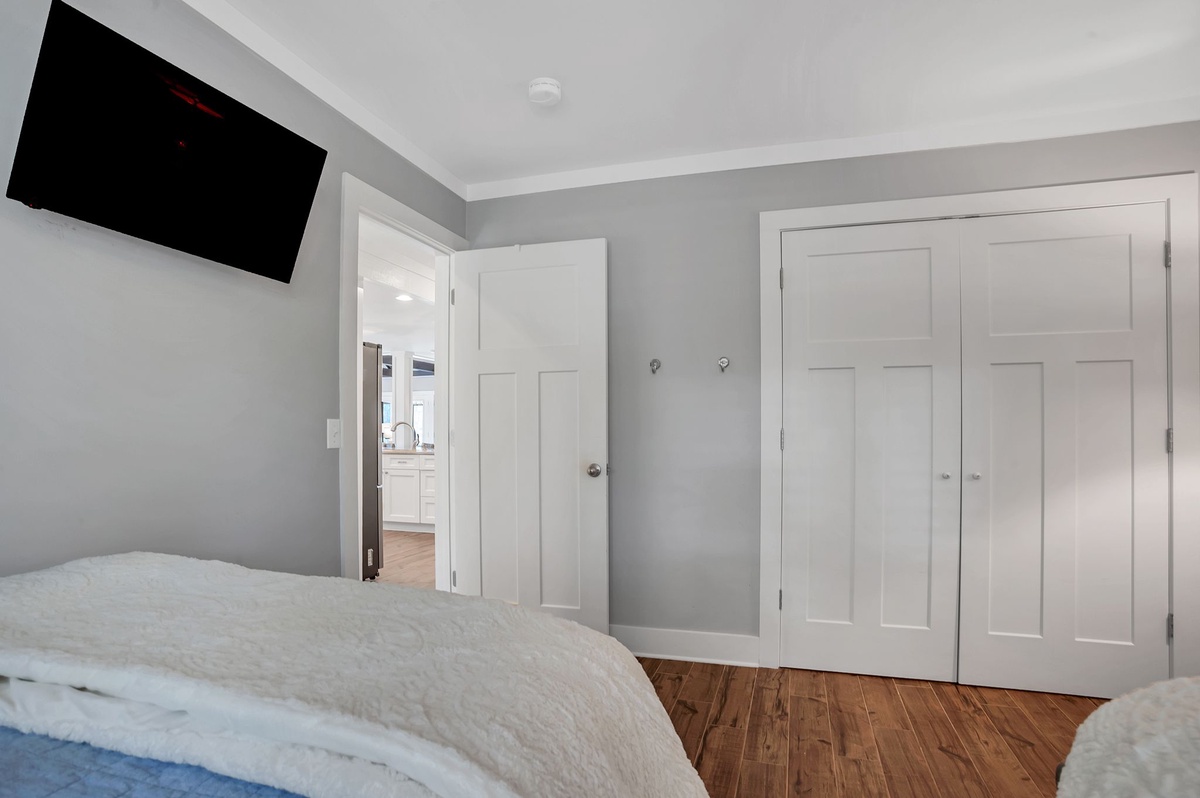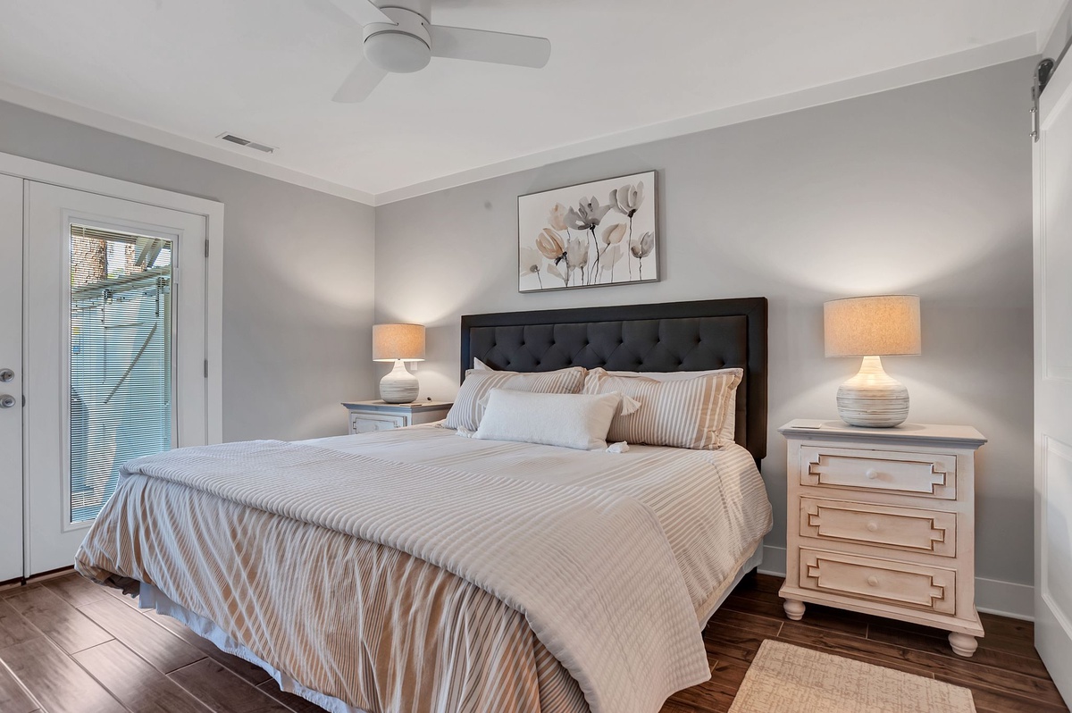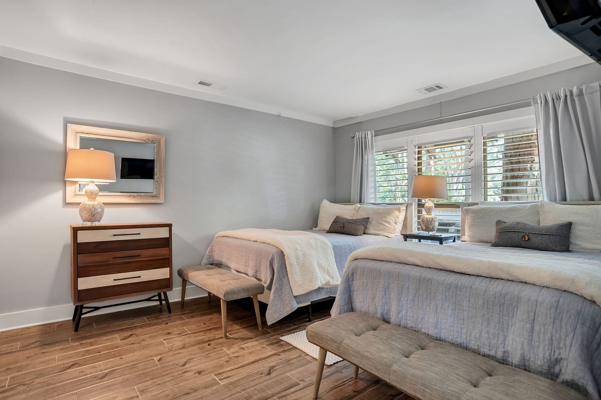 Boasting all the amenities of a fine resort, the master is as sophisticated in décor as it is loaded with comforts. With its king size bed facing a flat-screen TV, this room enjoys private access out to the rear patio as well as a private bath boasting dual-basin vanity and walk-in shower.