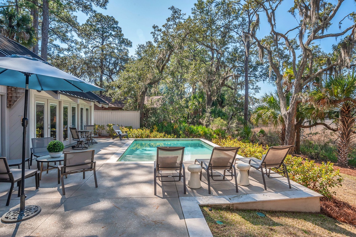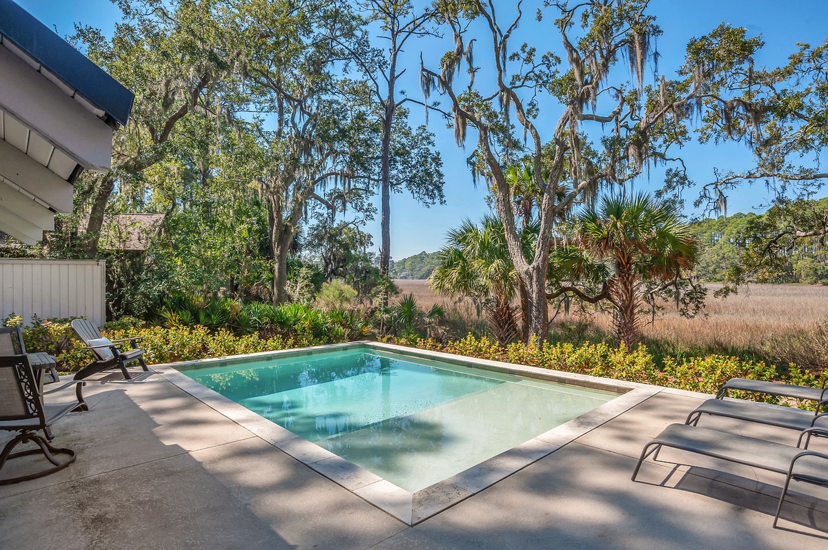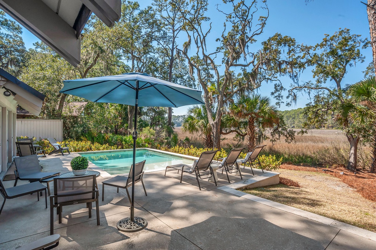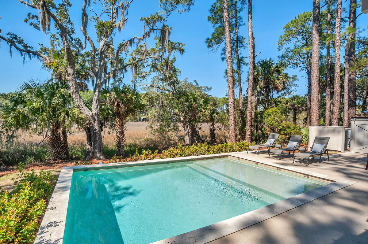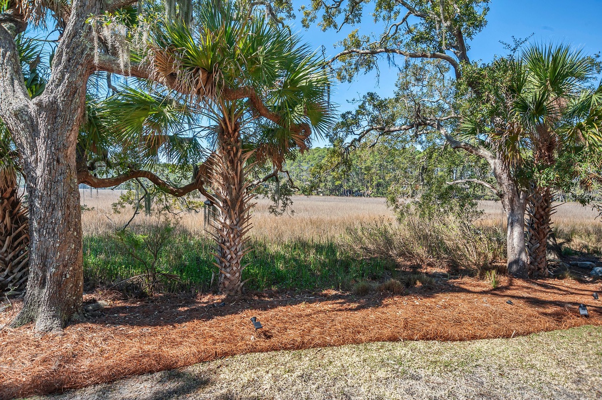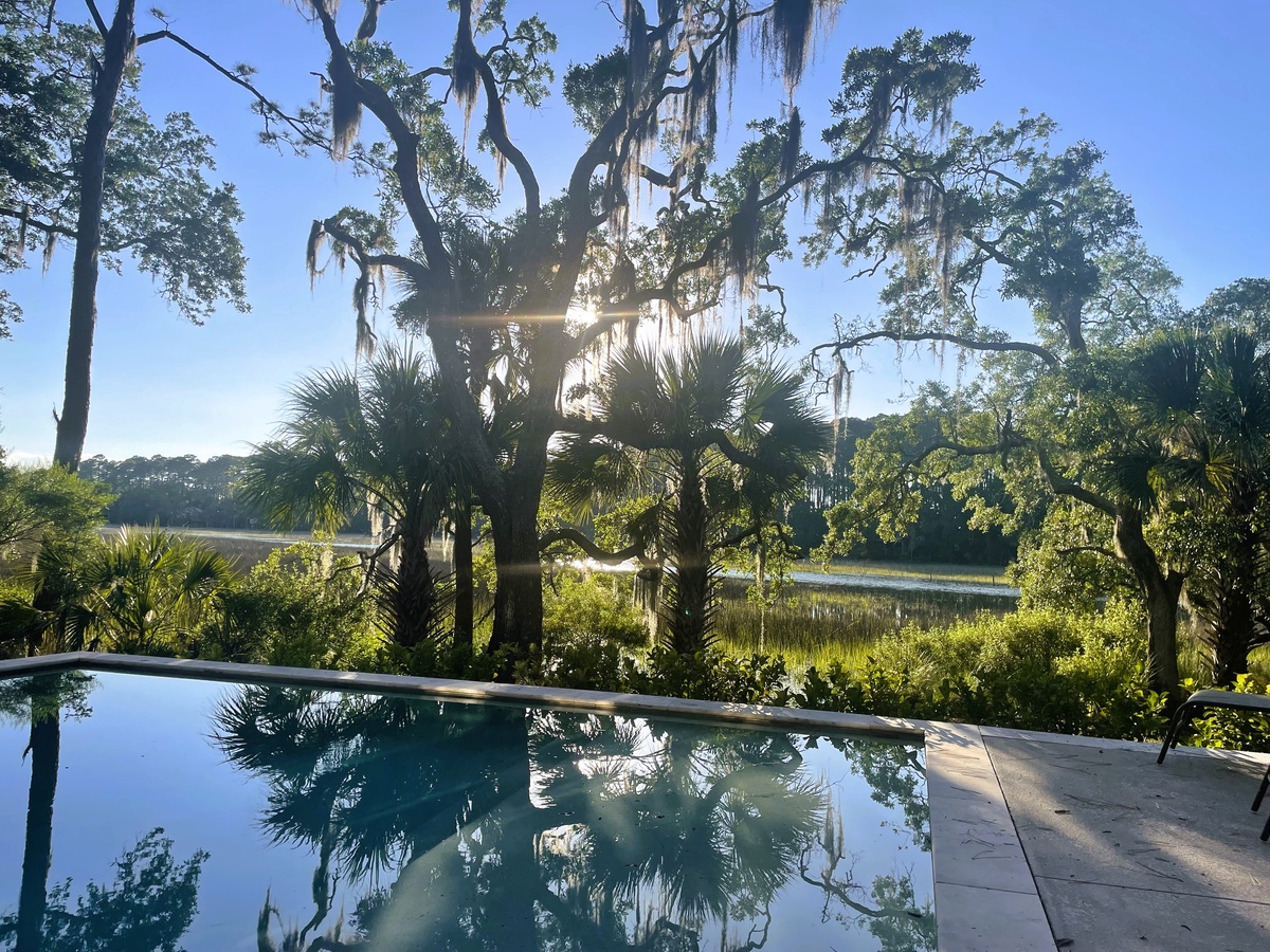 Just past a set of French doors you’ll find the crown jewel of this property – the magnificent outdoor oasis in back. A sprawling deck encircles the glittering waters of the swimming pool, providing the perfect vantage point for blissful marsh scenery that extends uninterrupted before you.