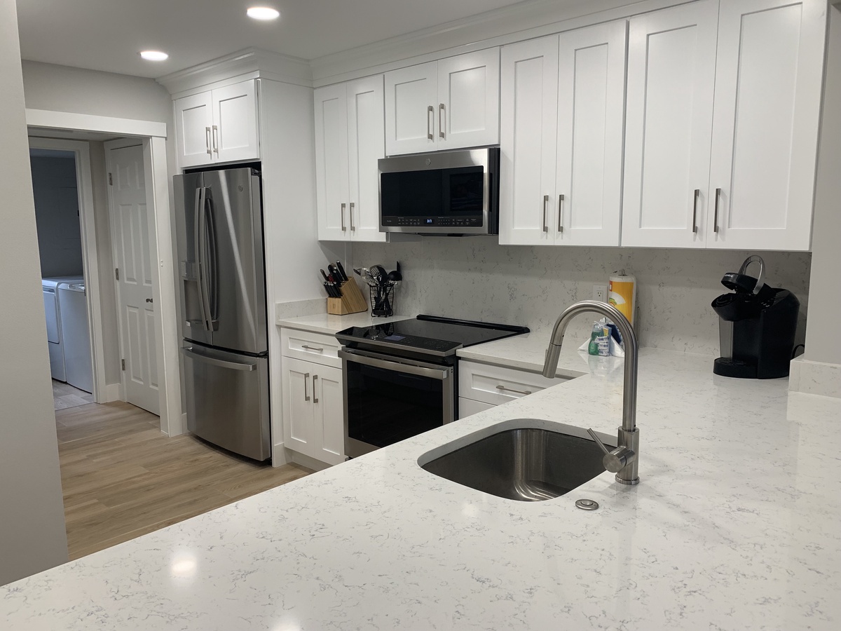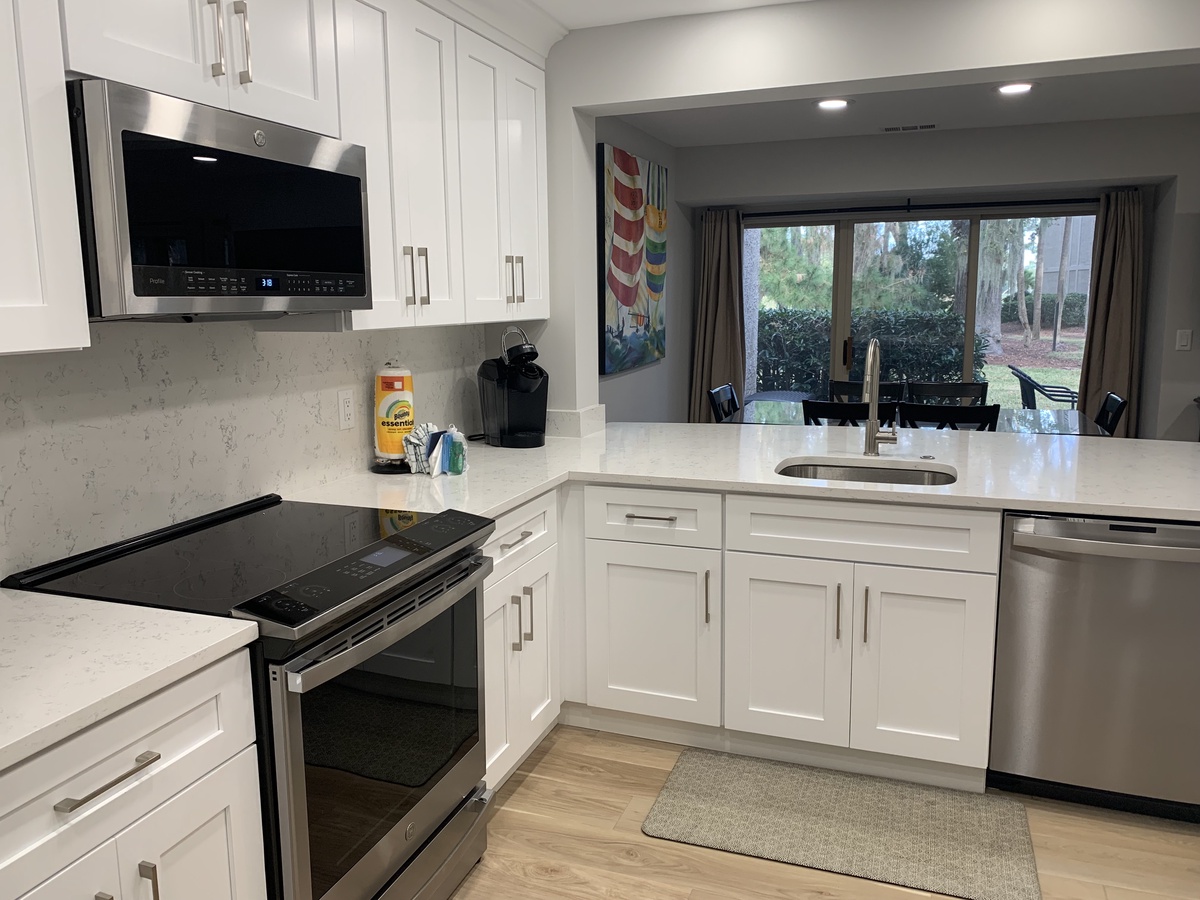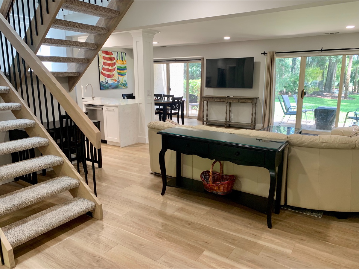 The dining area adjacent to the living area also has sliders to the back patio and perfect for enjoying the views during mealtime. There is a table with 6 chairs and 4 stools are provided at the breakfast bar. The kitchen has recently been totally renovated, with quartz countertops and stainless steel appliances, There is a laundry room and a convenient half bath on the first floor as well.