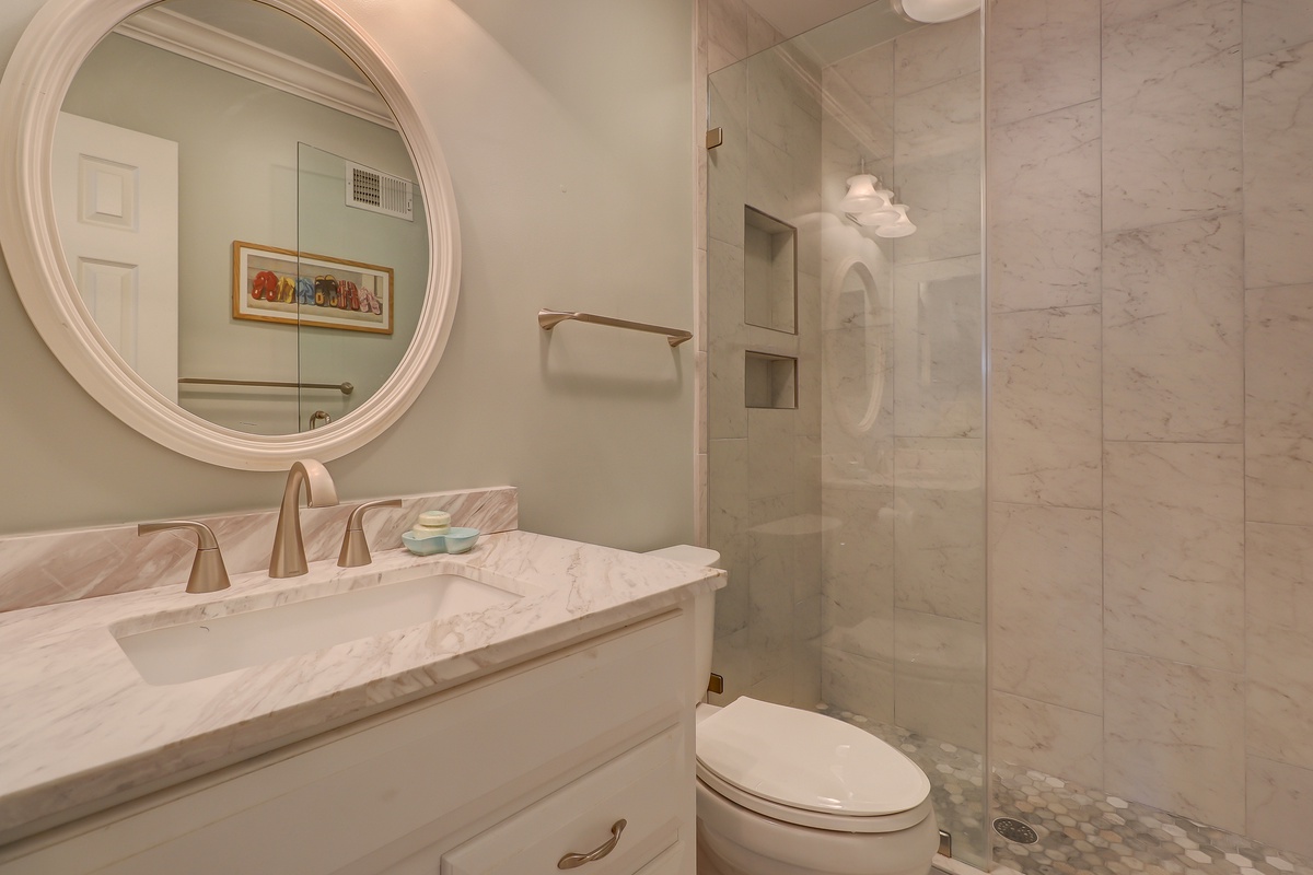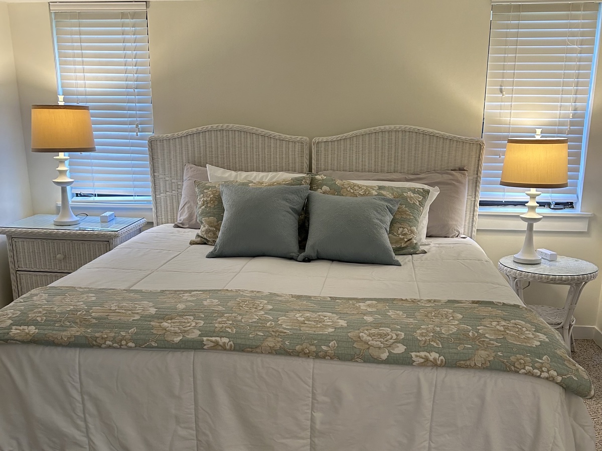 Upstairs are the 3 bedrooms all with a ceiling fan. The master bedroom has a king bed, a private balcony with golf views, and a flat screen TV. The renovated master bath is also private and features 2 sinks and a walk in shower. The first guest room has a swing king bed (can be made into two twins upon request prior to arrival) and a private full bath. The second guest room has a twin and a queen with striped bedding, a flat screen TV and a full private bath.