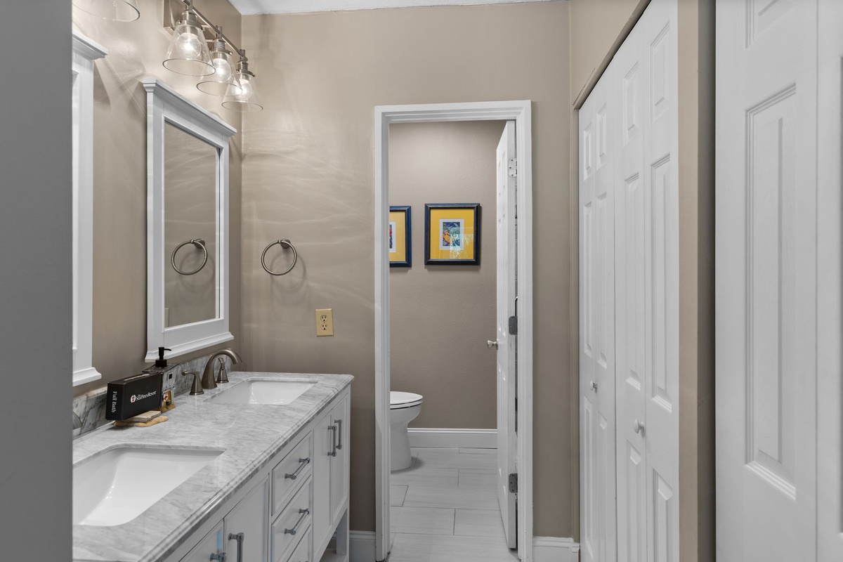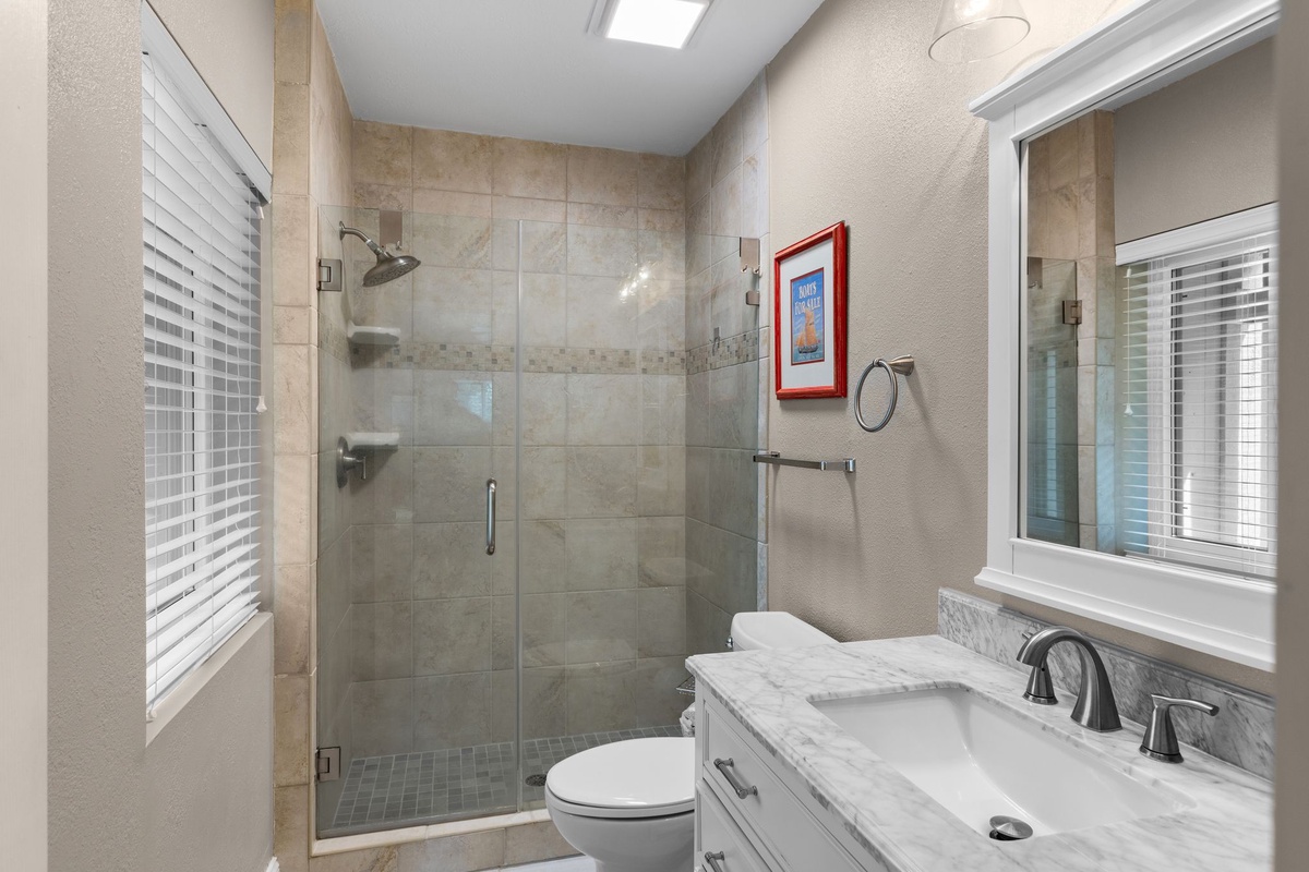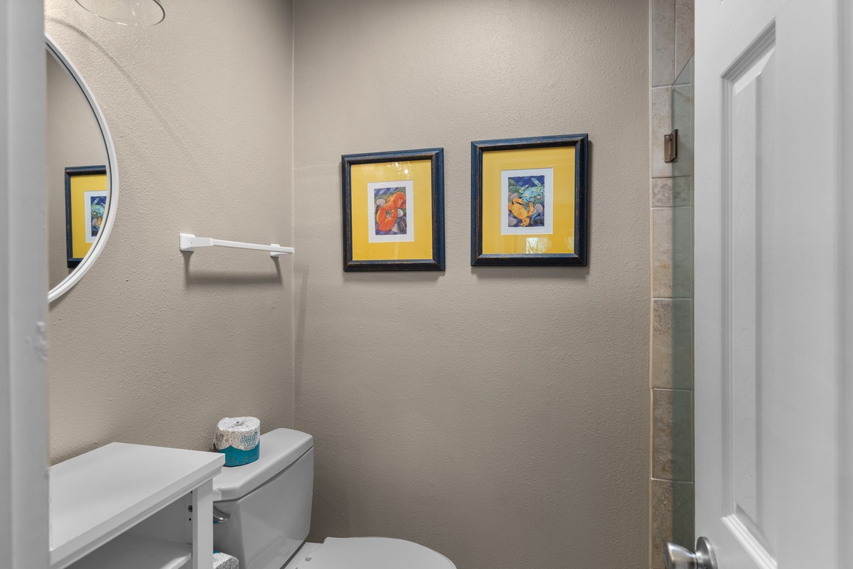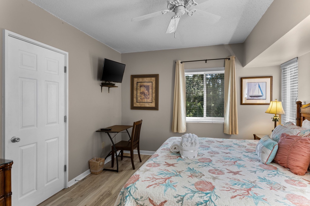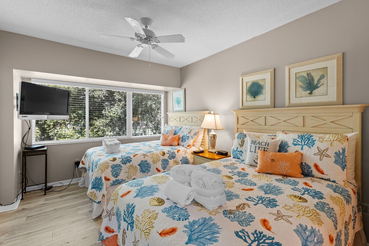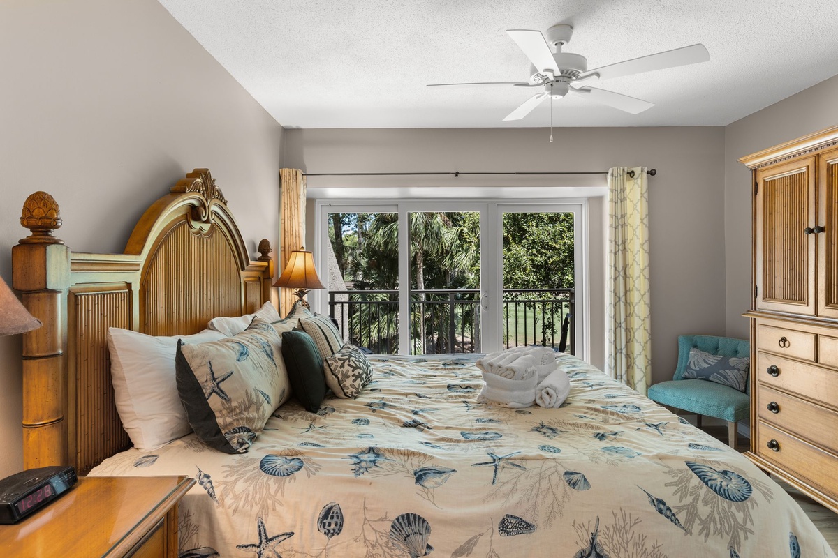Finally, the master sees a king-size bed paired with Caribbean-inspired furnishings in a room boasting its own private balcony via sliding glass doors, giving you an elevated view on the golf course beyond. Inside you’ll find a flat-screen TV concealed within an armoire, plus an extra wide-countered vanity with sink leading the way to an en suite with a separate single-basin vanity, and spacious walk-in shower.
