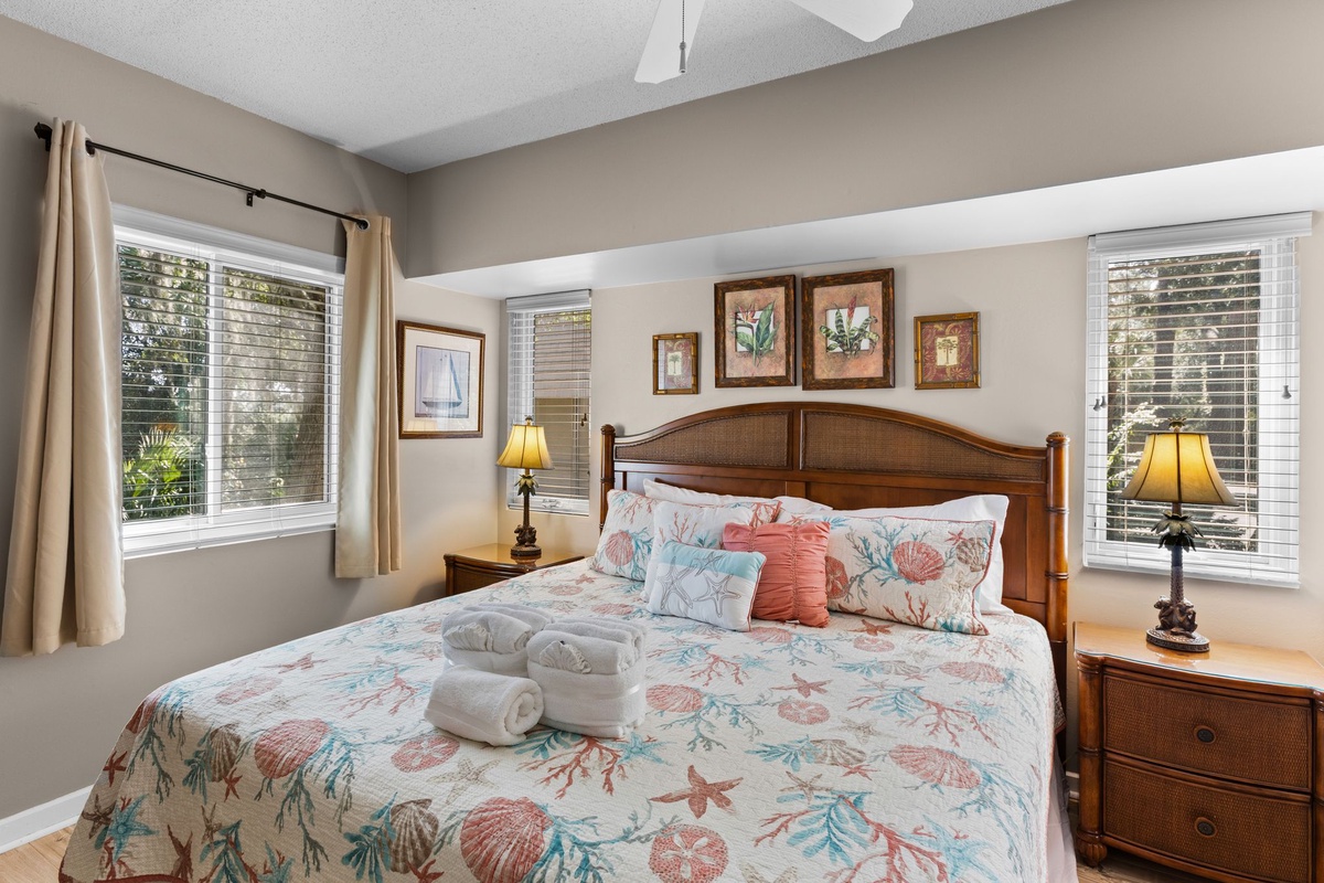 The first surrounds a king-size bed with tropical décor and beautiful natural light via windows on two walls. A wall-mounted flat-screen TV and en suite with single-basin vanity and walk-in shower add to the lavish comfort.