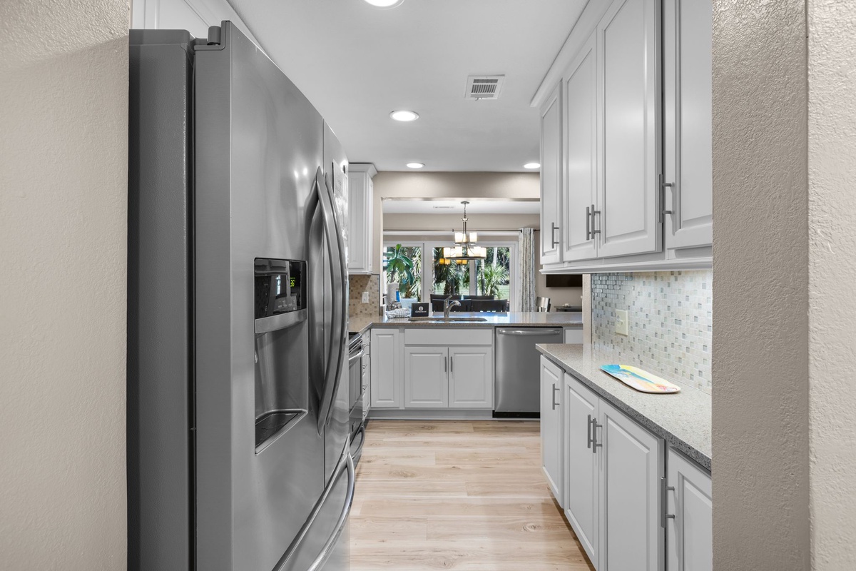 Glass-inlaid French doors to one side and a wall of sliding glass doors to the other fill the open living space with natural light, while showcasing sweeping golf views. A coastal-inspired paneled accent wall breathes comfort into a space boasting a wide sleeper sofa, loveseat and armchair plus a massive flat-screen TV. The nearby dining space offers seating for six around a wide oak table between exquisite golf views and eye-catching built-ins in wide composite countertop. This counter unites the space with the lavishly upgraded kitchen, boasting tile backsplash, stainless steel appliances and a fresh modern look.
