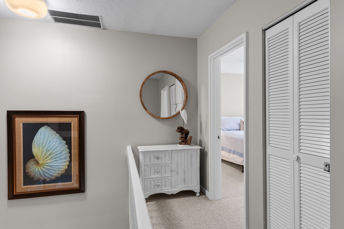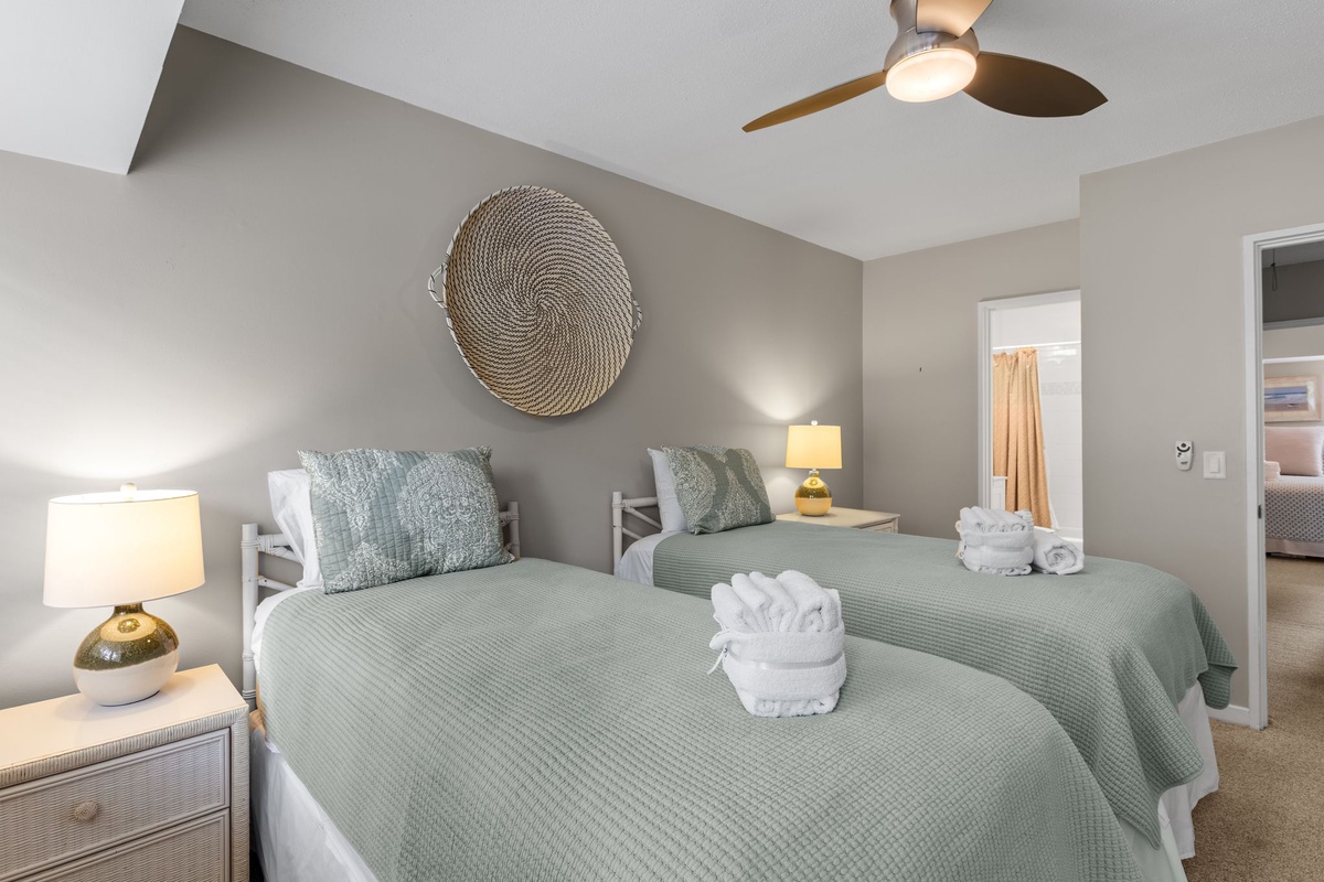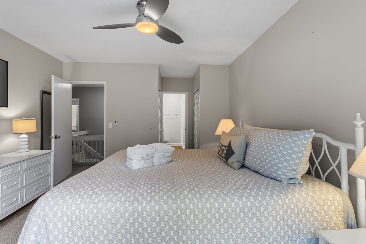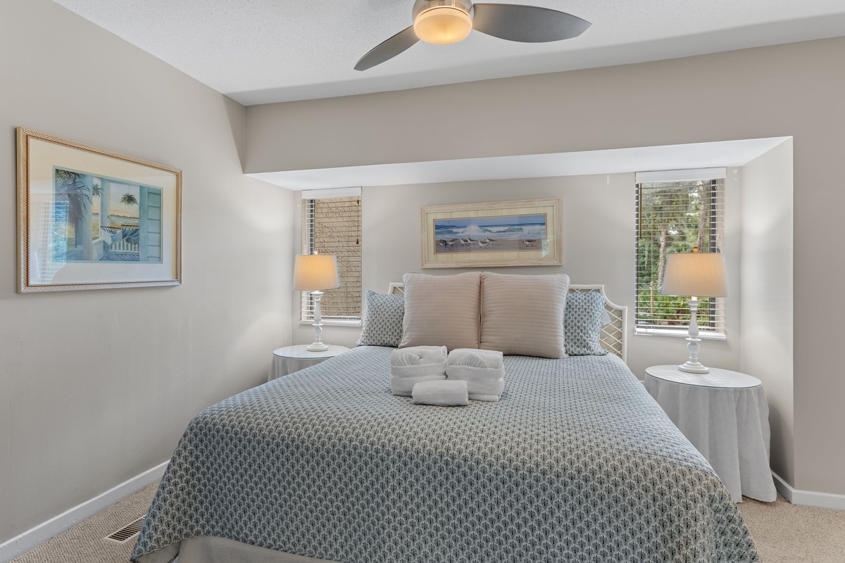 Three suites on the second floor share a landing illuminated by a soaring skylight. The first sees a king-size bed set at the heart of a suite with ceiling fan, flat-screen TV and ensuite bath with tub and shower. The second pairs two full beds beneath a ceiling fan, with an ensuite bath boasting a tub and shower. The final suite, serving as a gorgeous primary, places a king-size bed beneath a ceiling fan, with a flat-screen TV and private balcony overlooking the golf course arrayed around it. The spacious ensuite bath enjoys a tub and shower of its own.