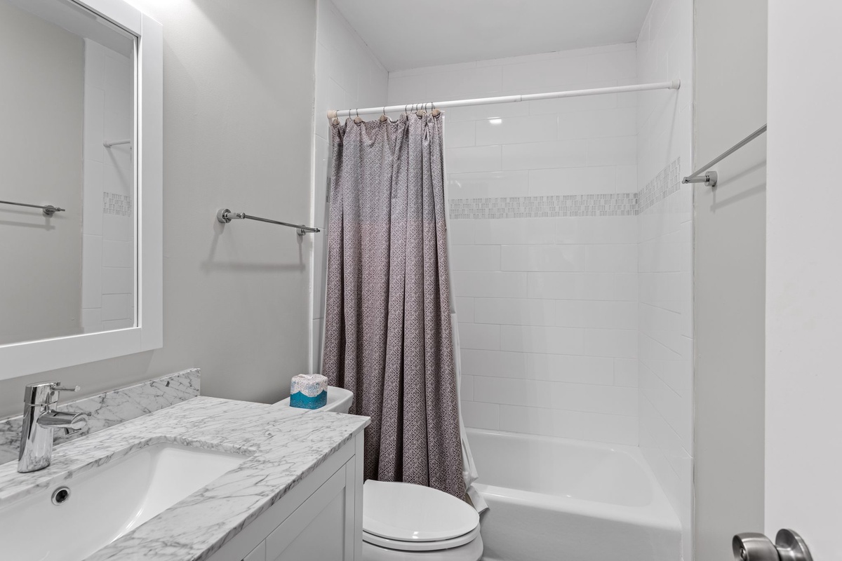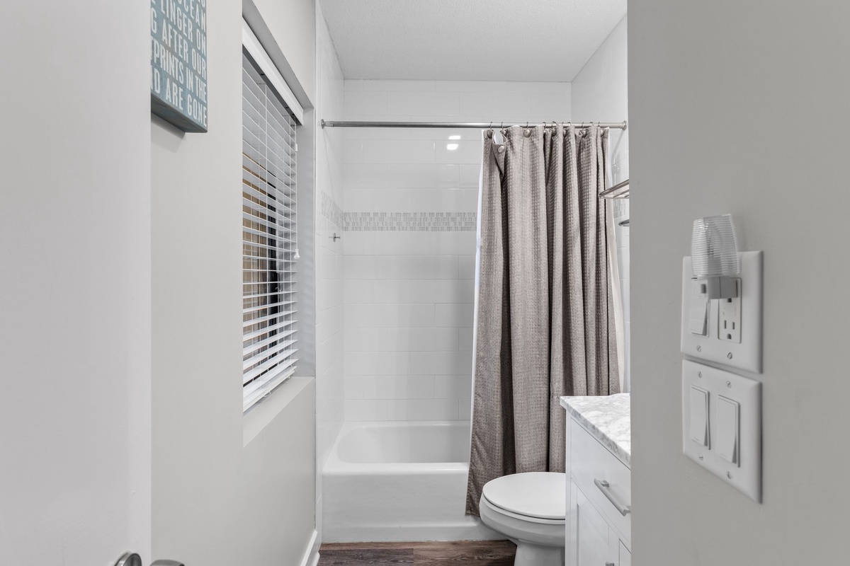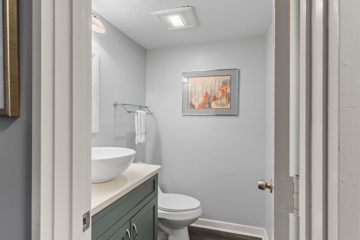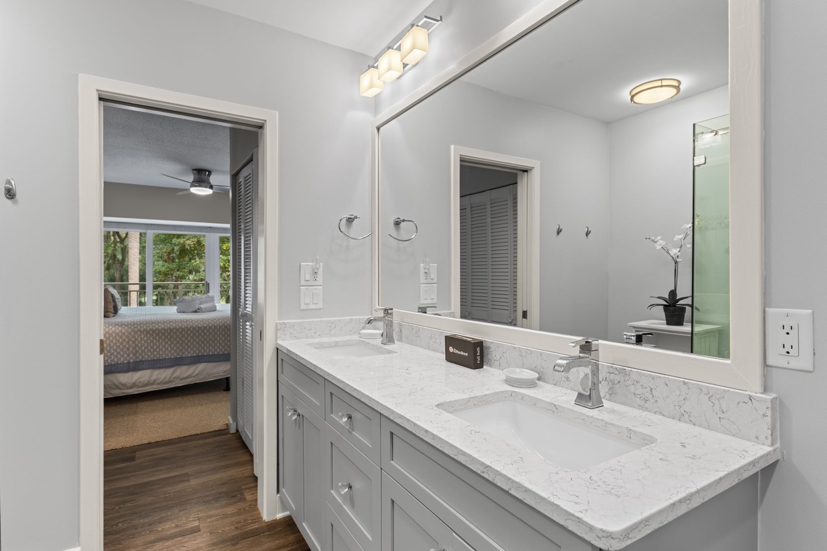 Three suites on the second floor share a landing illuminated by a soaring skylight. The first sees a king-size bed set at the heart of a suite with ceiling fan, flat-screen TV and ensuite bath with tub and shower. The second pairs two full beds beneath a ceiling fan, with an ensuite bath boasting a tub and shower. The final suite, serving as a gorgeous primary, places a king-size bed beneath a ceiling fan, with a flat-screen TV and private balcony overlooking the golf course arrayed around it. The spacious ensuite bath enjoys a tub and shower of its own.