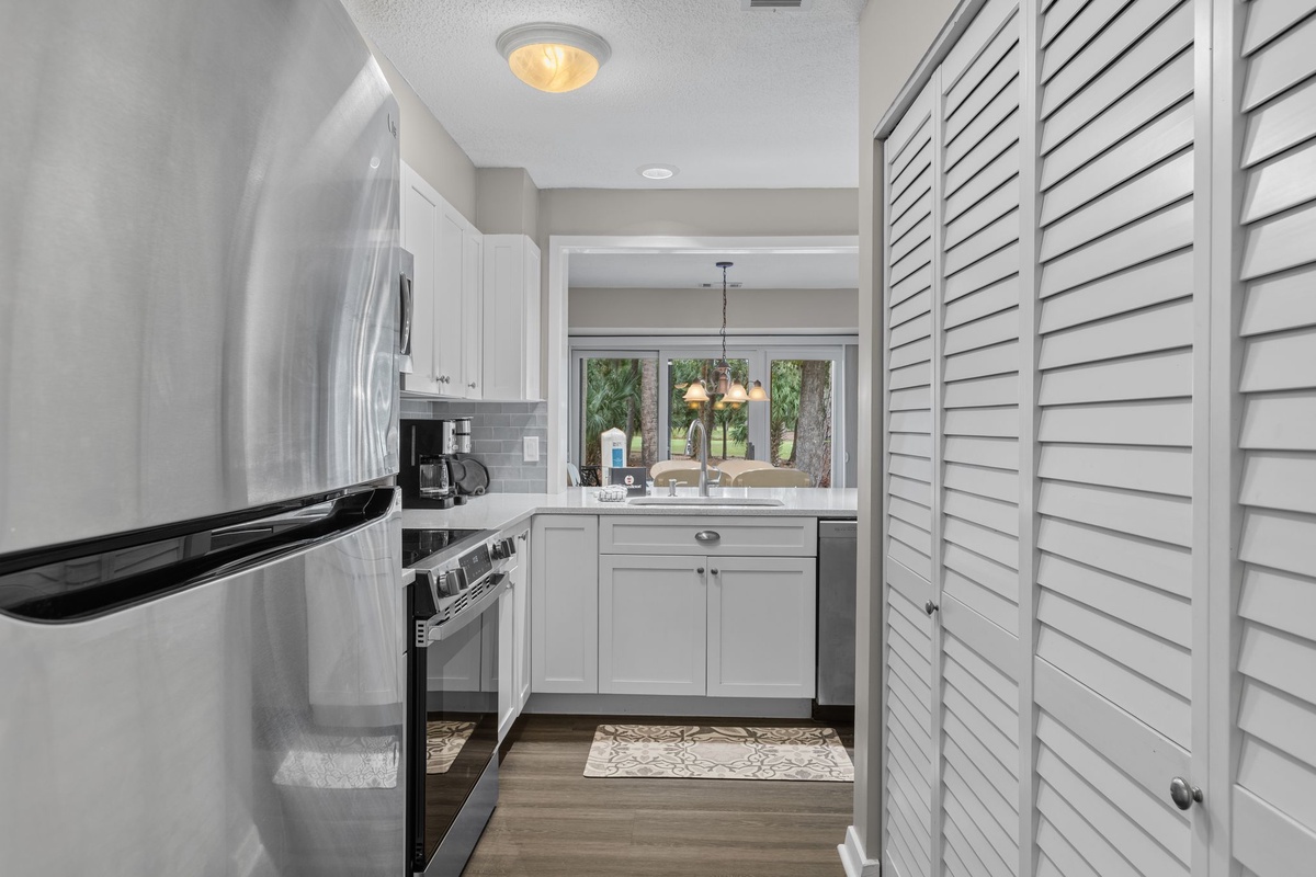 Centered on a sprawling great room exulting in views of the course, the main living spaces enjoy lush natural light and a blissful sense of airiness. In the great room, dual armchairs and dual sofas offer lush comfort, facing a flat-screen TV. This transitions into the open dining with seating for six, with sliders in both rooms leading out to a shaded patio with outdoor dining for four. Open to the dining room through a pass-through counter, the kitchen boasts speckled granite counters and updated stainless steel appliances. Tucked away at the rear, a hall takes you past the washer and dryer to a ground-floor half bath.
