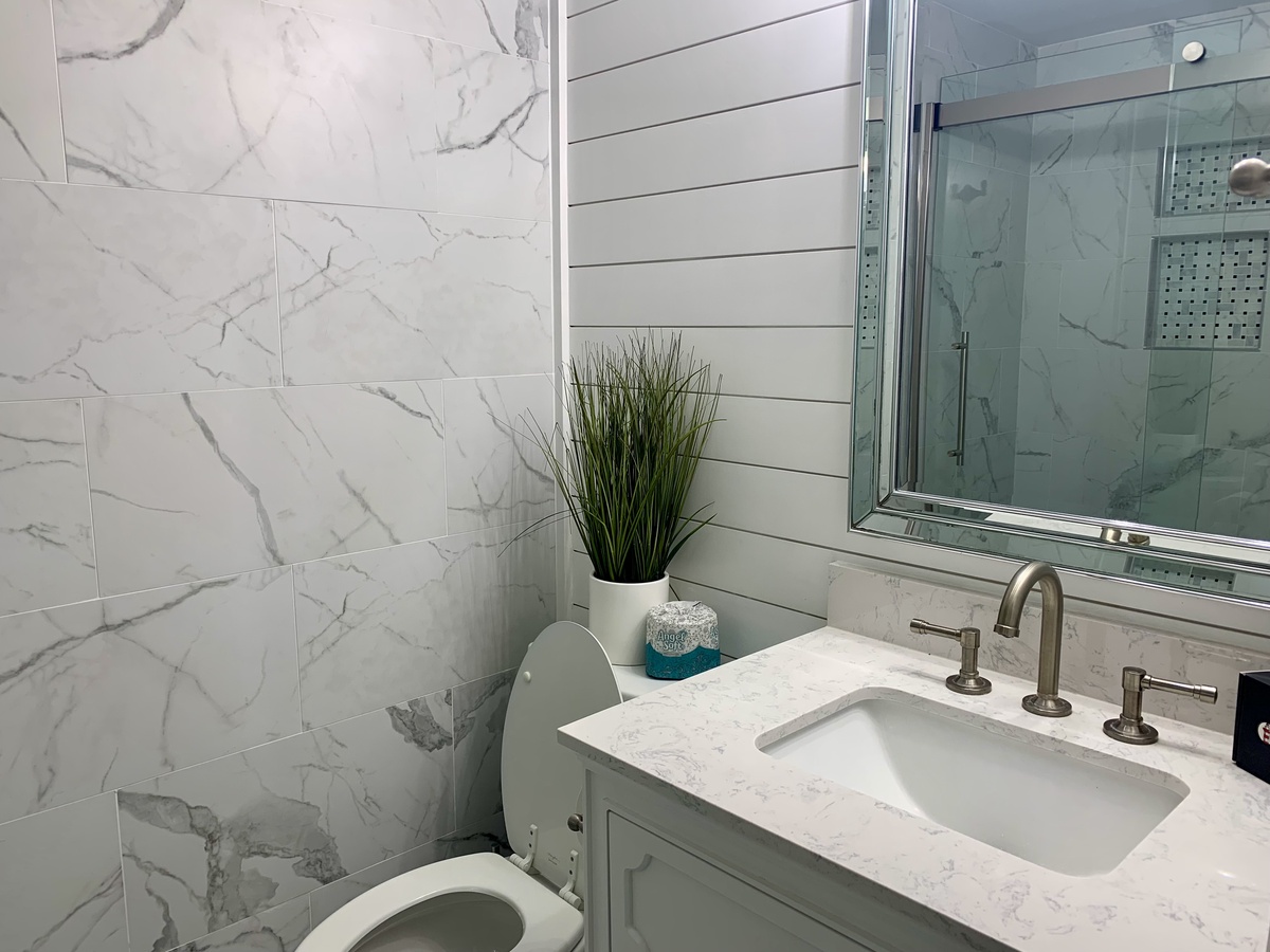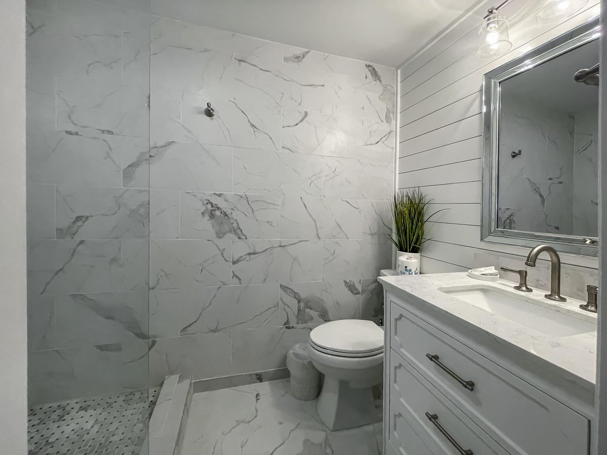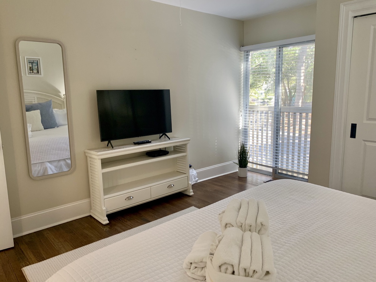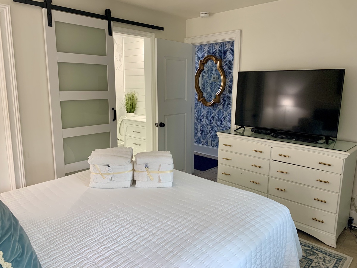 A further guest room downstairs boasts a queen size bed surrounded by custom built-ins in a space with flat-screen TV and en suite bath with walk-in shower tucked behind a farmhouse door of frosted glass.