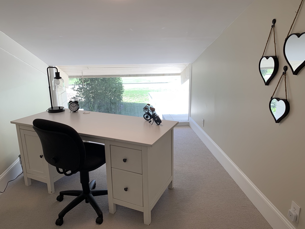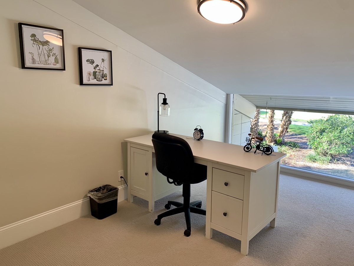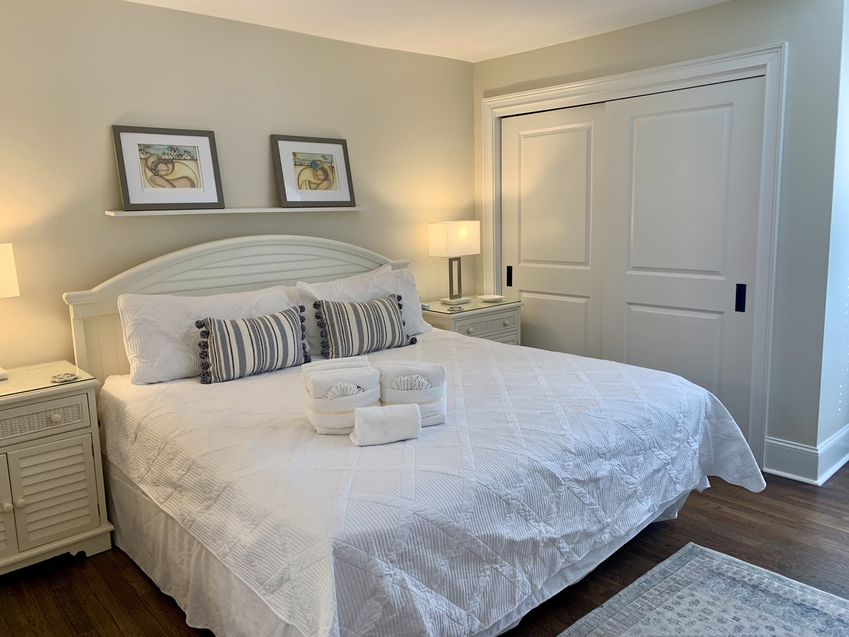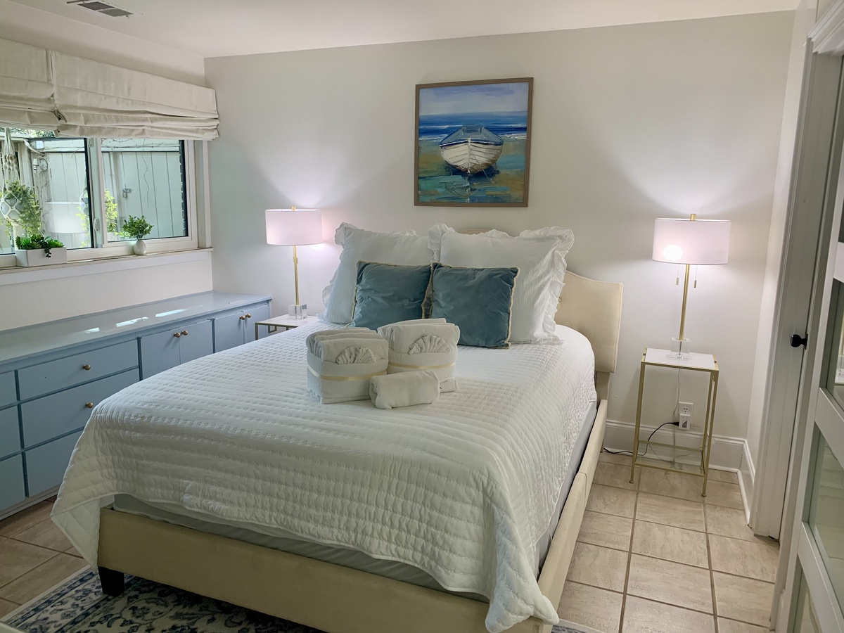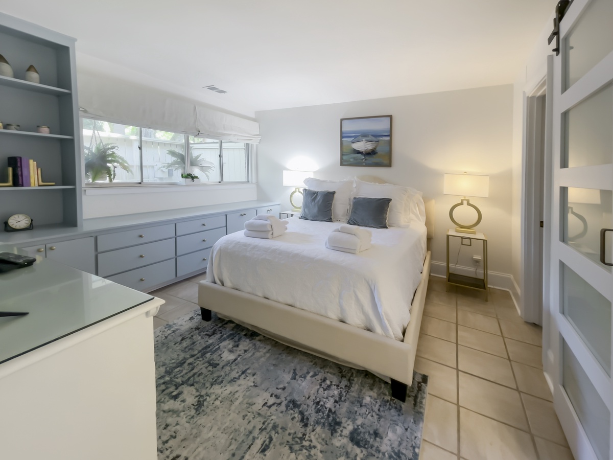 Set up a set of stairs with a custom railing, you’ll find a pair of lushly comfortable guest rooms as well as a generously spaced office for those taking a working vacation. Both upstairs guest rooms enjoy luxurious amenities like king-size bed, flat-screen TV, sliders which open wide to let the sea breezes in, and en suite baths.