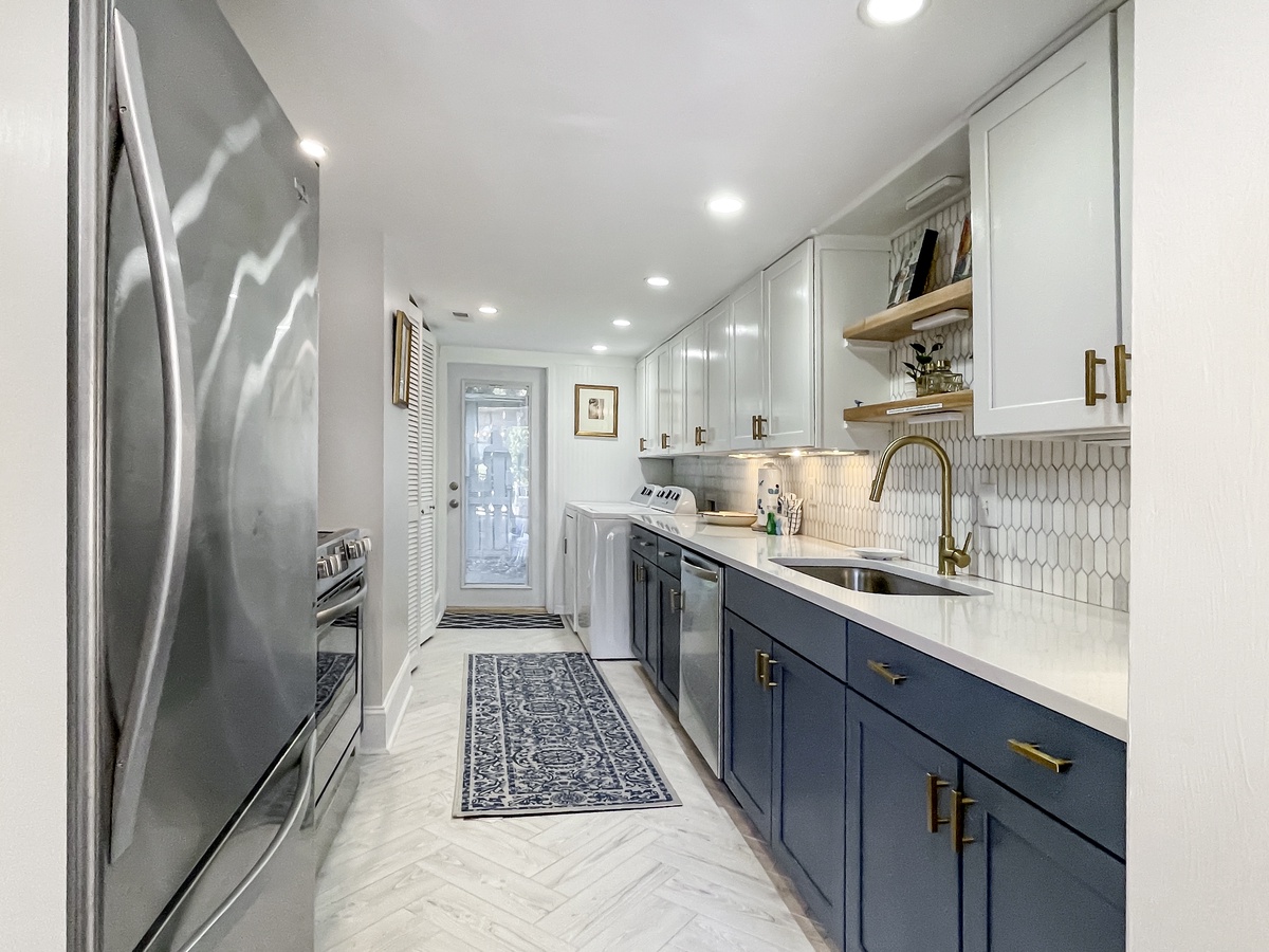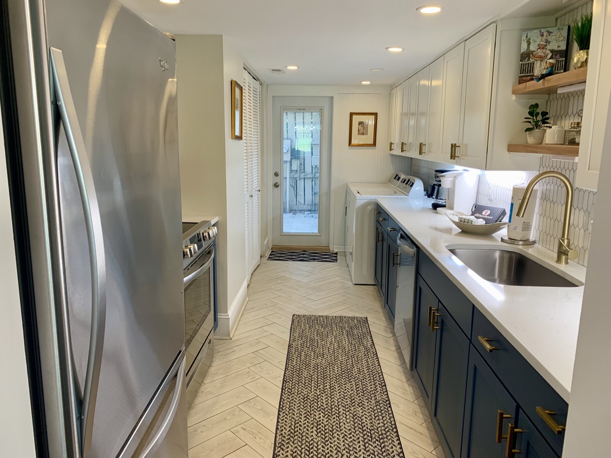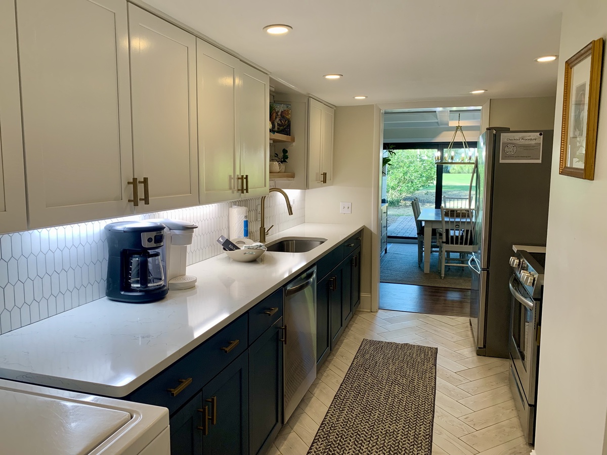 To the other side of this great room, a stately dining room with tray ceiling and chandelier offers seating for six flanked to one side by sliders that guide you out to a lovely patio. To the other side, the updated galley kitchen with its state-of-the-art appliances offers everything you need to create a gourmet meal, with a nearby washer and dryer for convenience.