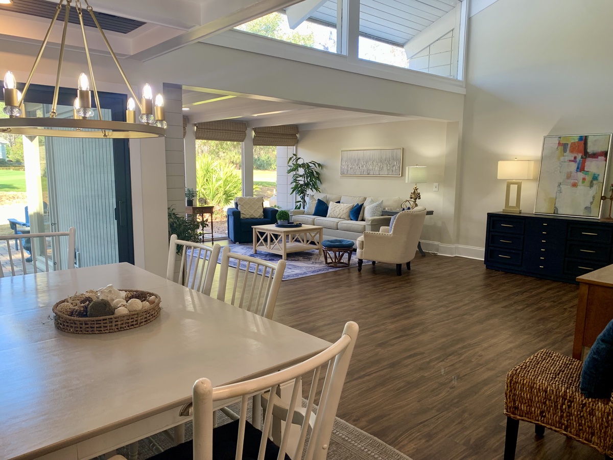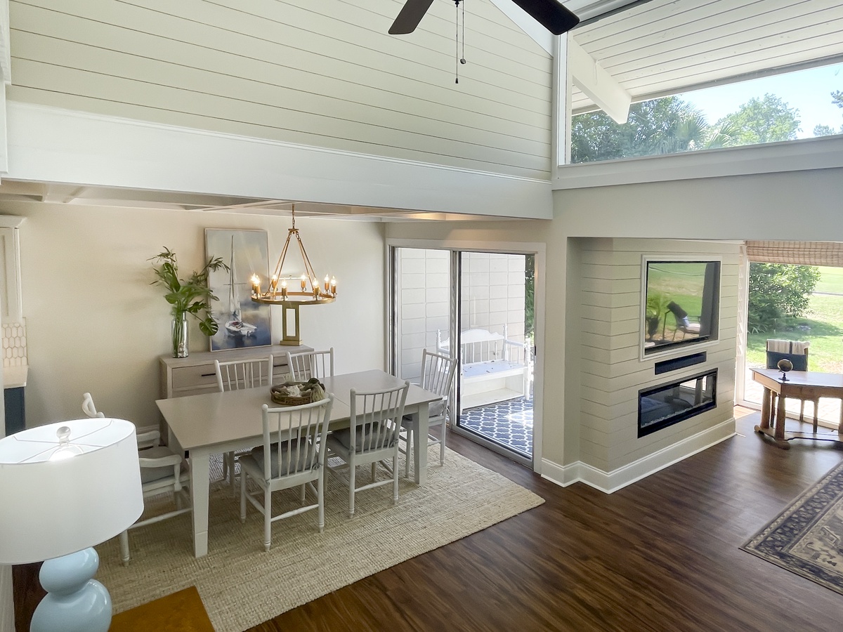 The lushly open main living spaces exult in natural daylight from tall ceilings that soar up toward skylights. From here, you an enjoy a panoramic view of the 12th hole at Atlantic Dunes just beyond a picturesque stone patio that fills the entire space. Take in the view from the spacious Carolina room where sofa and dual armchairs face an accent wall of shiplap, built-in flat-screen TV and decorative fireplace beneath exposed beam ceilings.