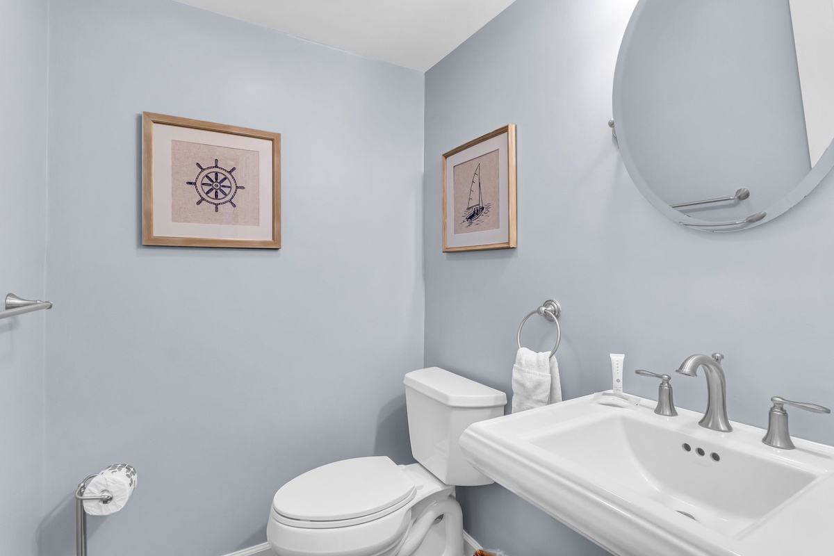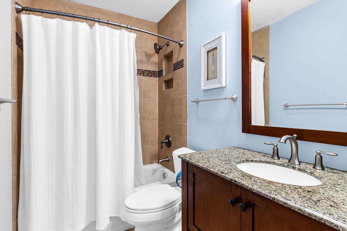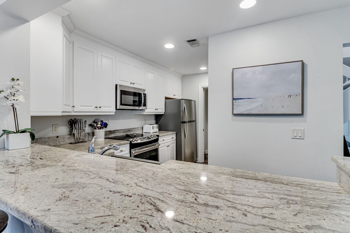 Throughout, you’ll find a host of amenities to cater to your every need during your stay. This includes a full washer and dryer, plus a separate half bath on the ground floor. And in the kitchen, you’ll find exquisite updates including stainless steel appliances and granite counters which wrap around to bar seating for four.