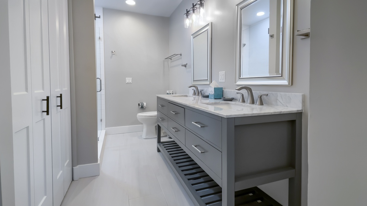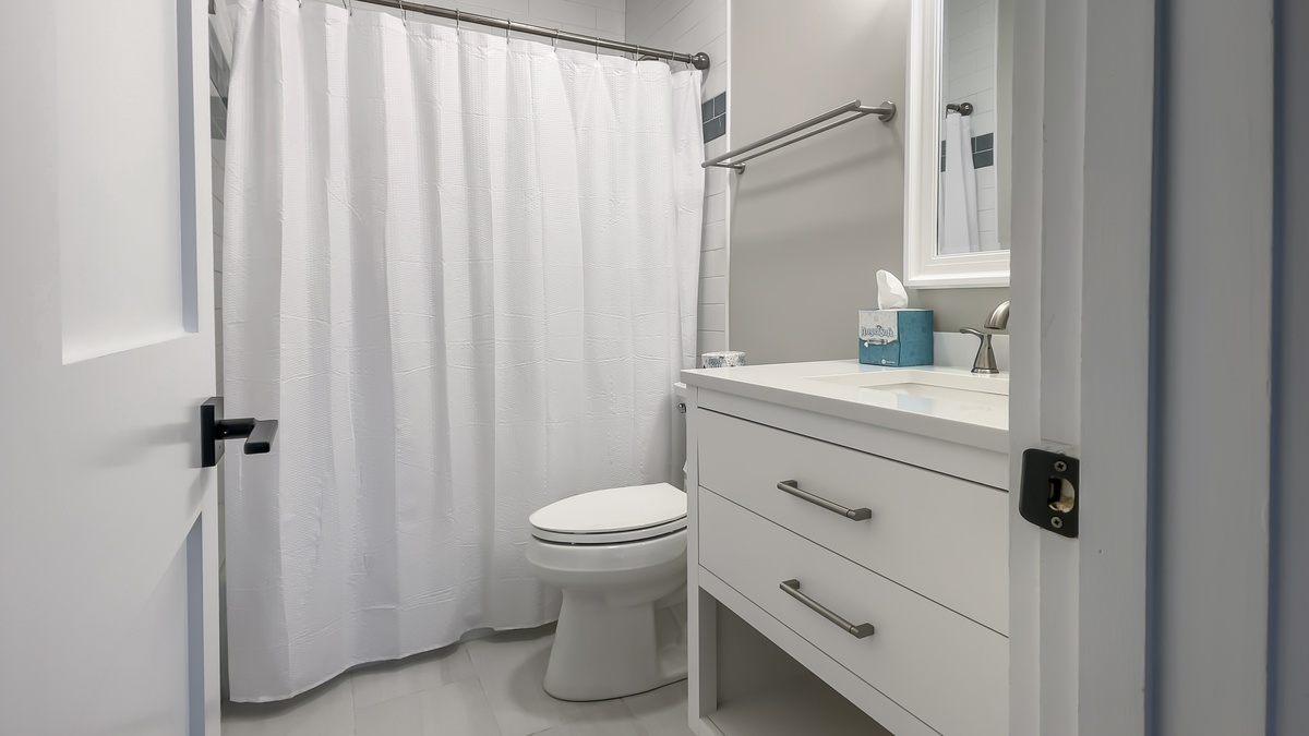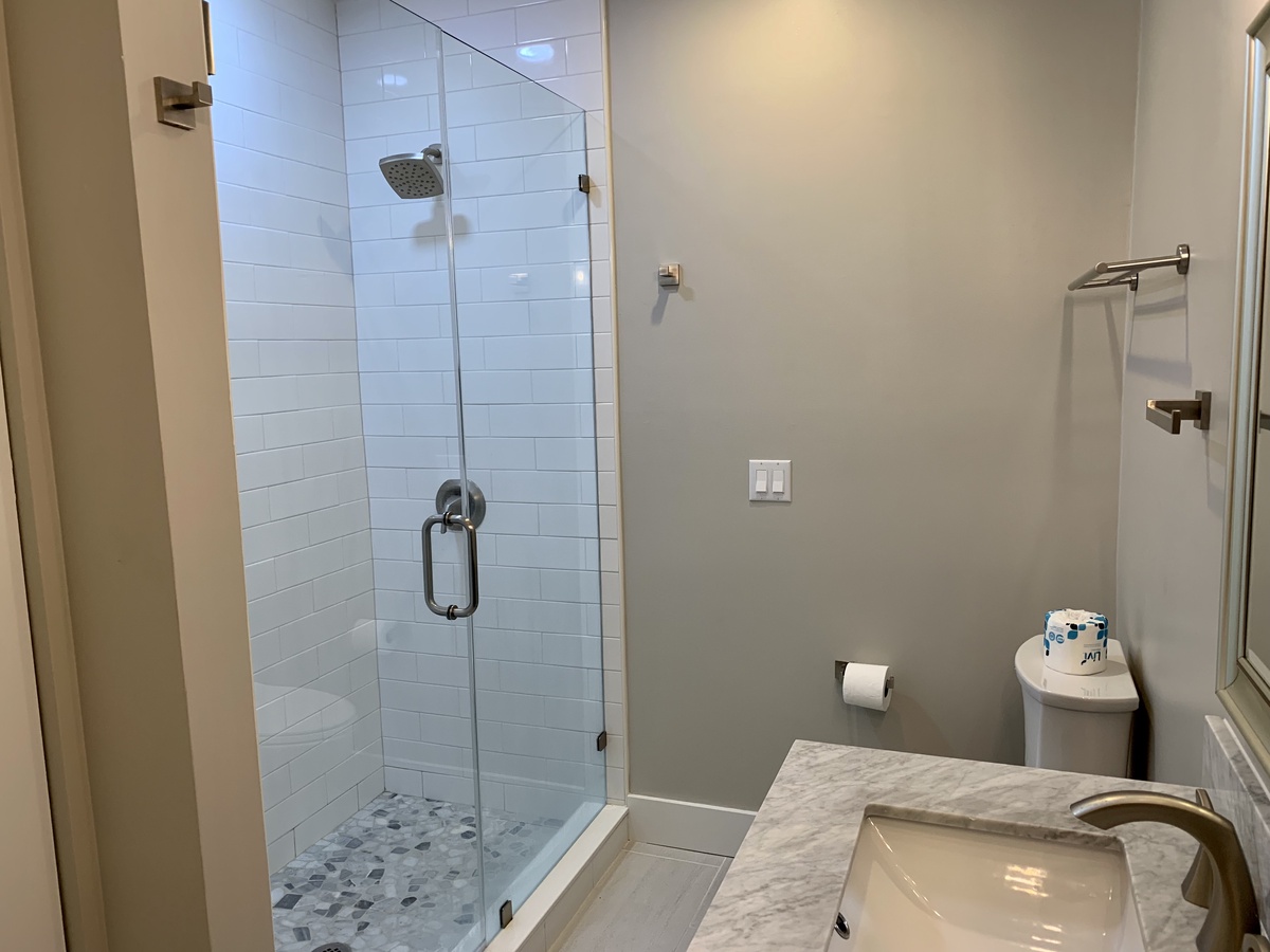 The next bedroom, also with a king-sized bed, showcases a ceiling fan, TV, two closets and private bathroom.