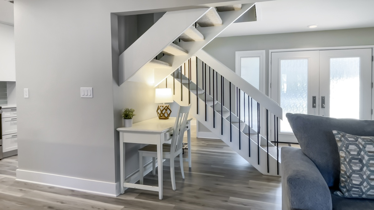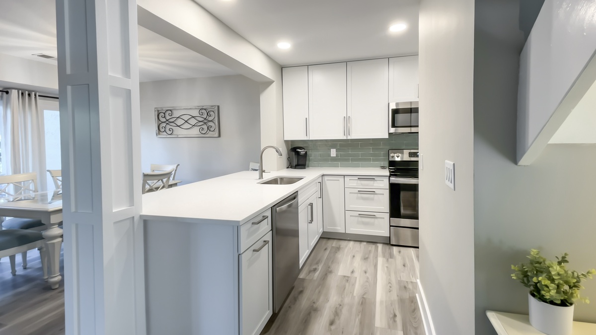 The dining area, which also enjoys the golf view, seats six at its glass table, with ceiling fan above. The kitchen provides every major appliance including a flat cooktop and full-sized washer and dryer. A half-bath is downstairs as well.