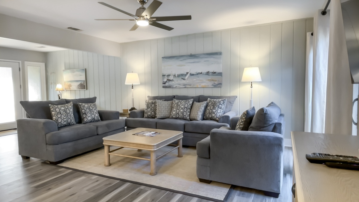 The living room features comfortable seating including a sofa and loveseat. The room also offers a large flat screen TV. Sliding glass doors reveal a lush view of the Atlantic Dunes and a pebbled patio with outdoor seating for four.