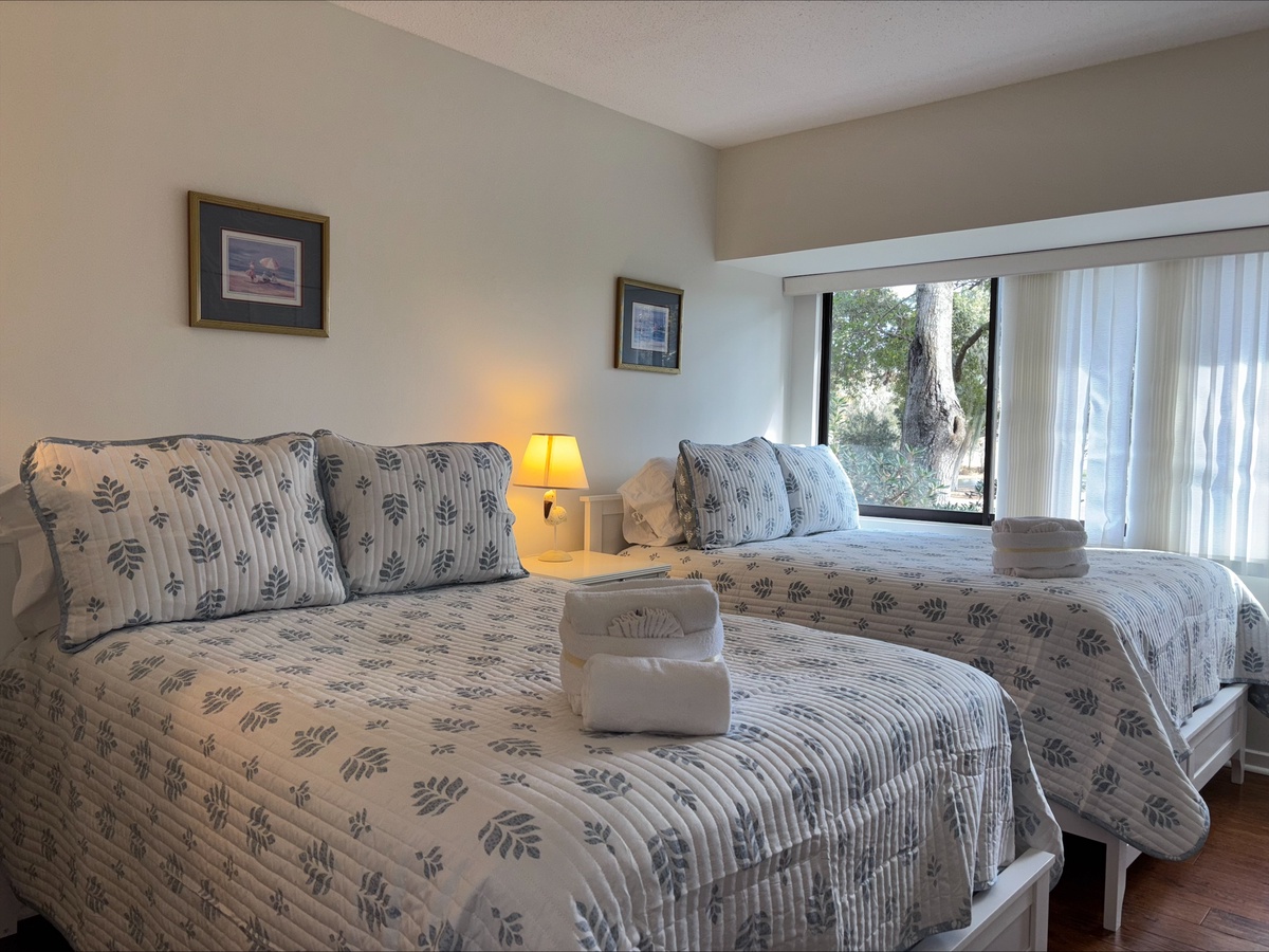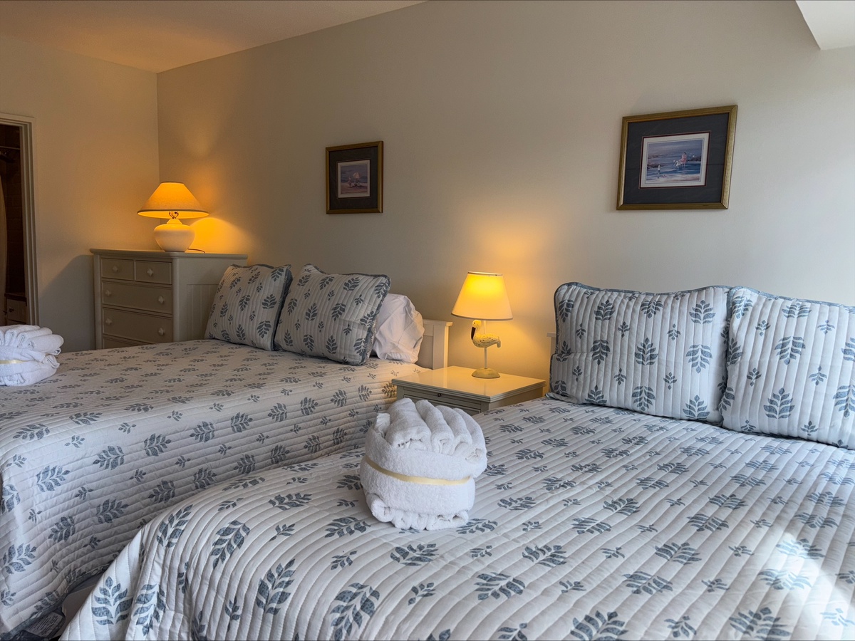 Two more bedrooms round out the amenities, one with two double beds and one with a comfortable queen, each with its own en suite featuring tub and shower.
