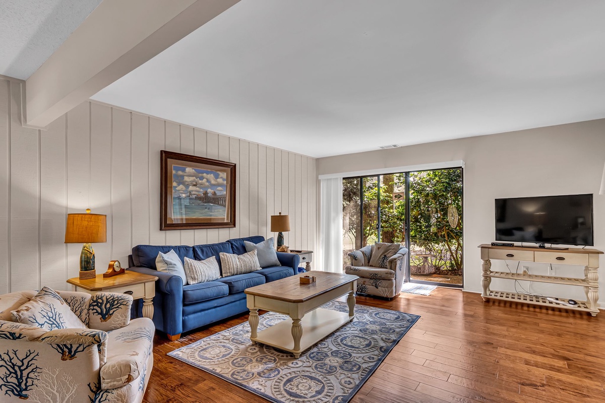 As soon as you walk in, you’re greeted by a jaw-dropping view of the 9th fairway at Ocean Course courtesy of a wall of sliding glass doors that showcase the view with elegance. An open living space frames this one-of-a-kind vista, with stone tile flooring in the foyer transitioning beautifully to rich hard woods.