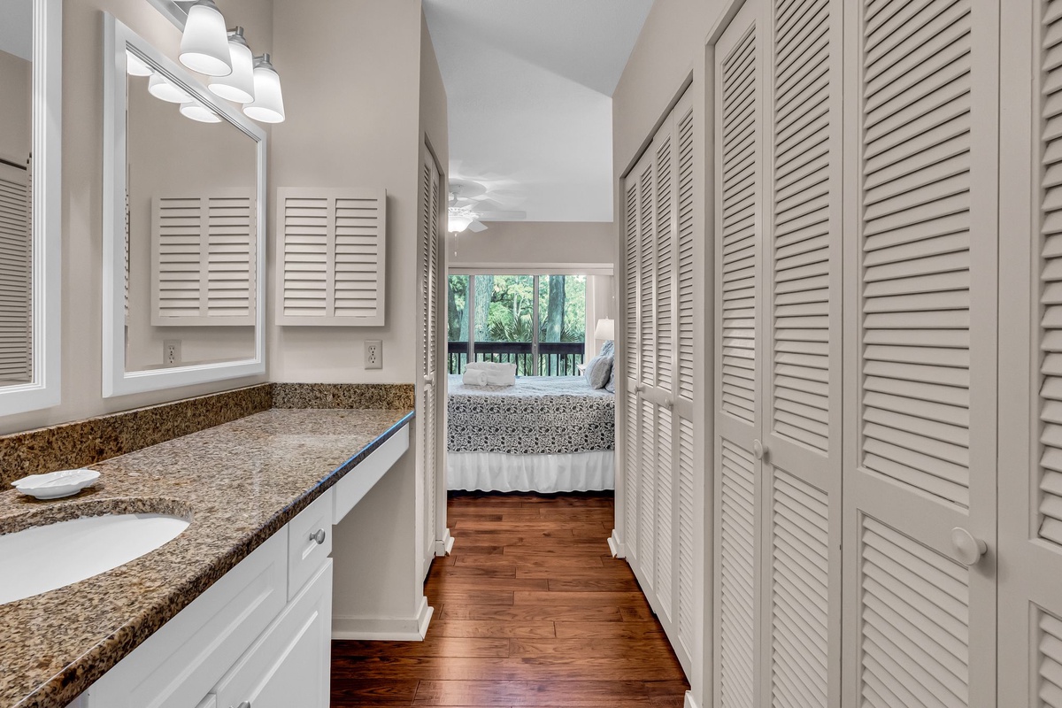 The master suite pampers guests with a spacious king size bed, flat-screen TV and a lovely private balcony overlooking the golf course. An attached vanity with ample counterspace guides you into a spacious spa-like en suite.