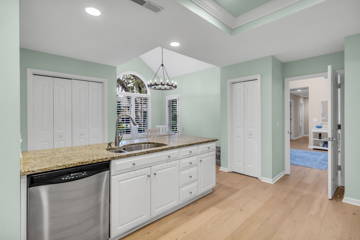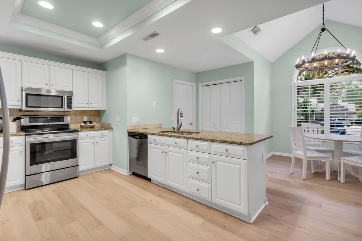 Serving as the gathering spot for the entire family, the great room opens before you on entry, with soaring vaulted ceilings that showcase a living space anchored around a marbled decorative fireplace, mirrored wet bar and a plush sectional sofa. Stretching away from this space, formal dining for eight surrounds itself with panoramic views of lush foliage and access to a screened patio with outdoor sectional that opens to a sun-kissed wooden deck ringed by trees.