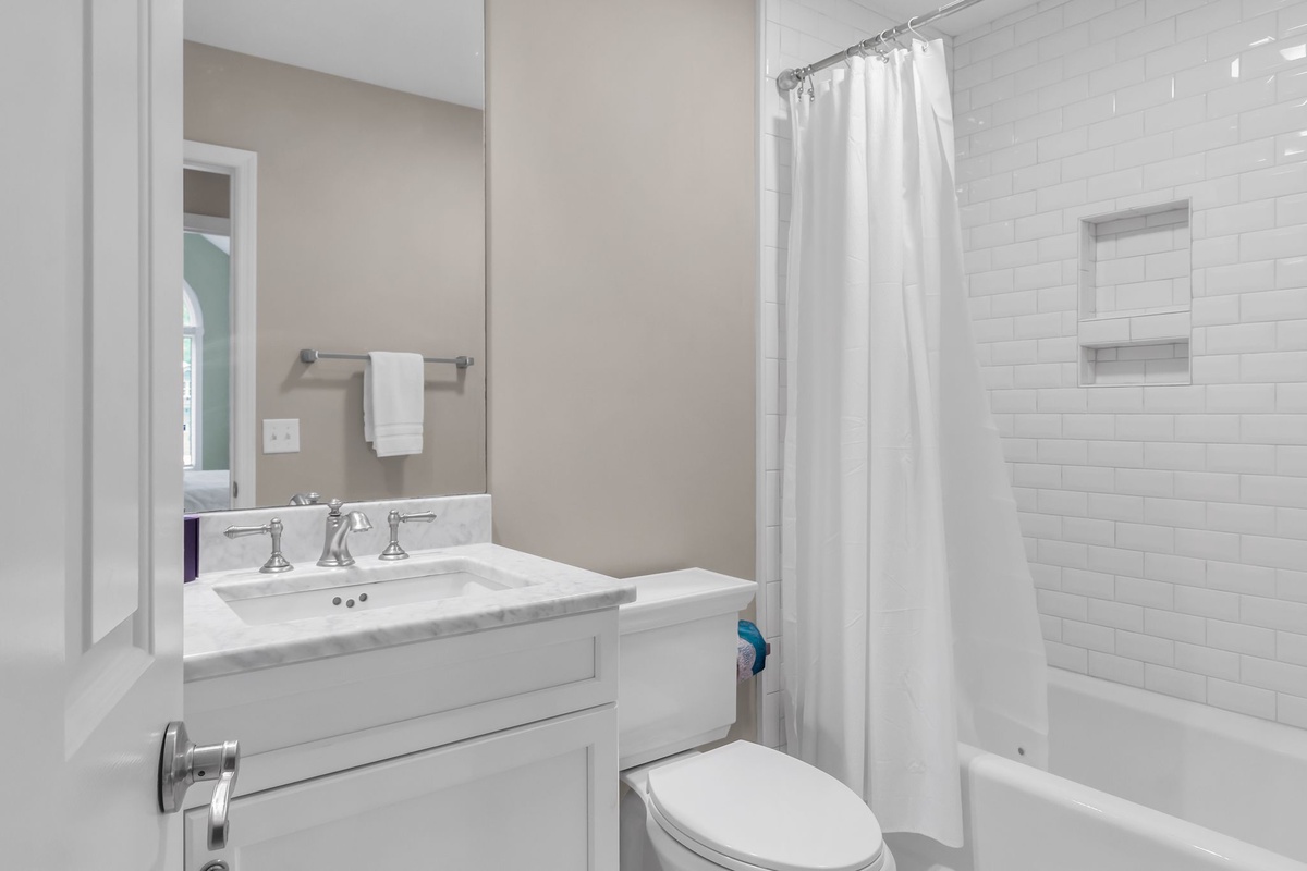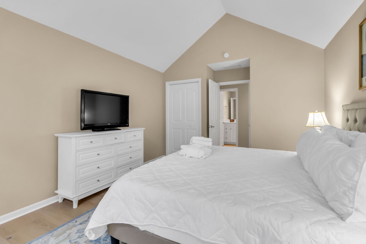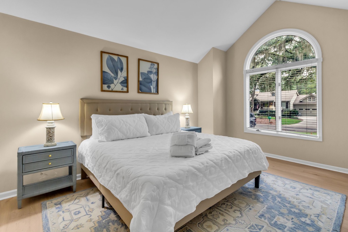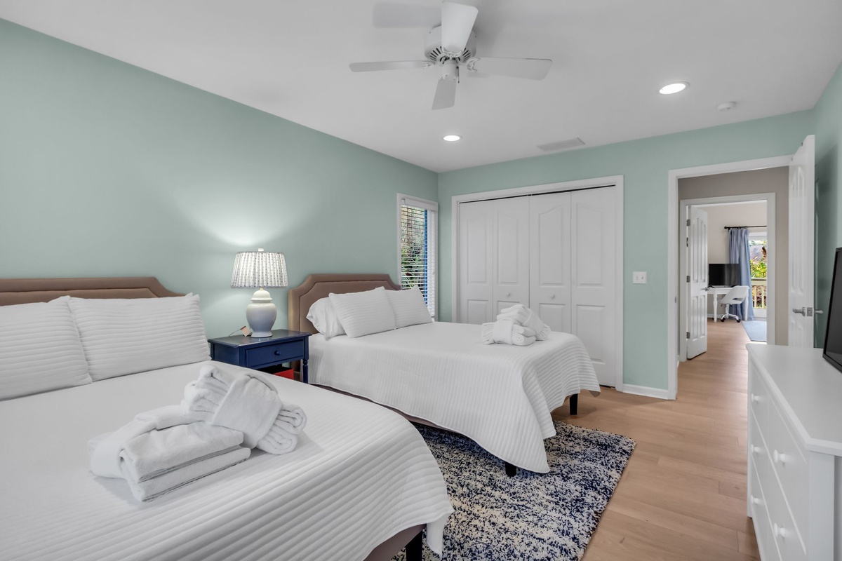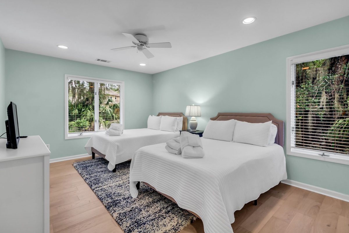 The first of three guest rooms pairs a full size bed with a queen size bed in a space with ceiling fan, flat-screen TV, plentiful windows and ensuite bath of white marble and tile with tub and shower. The next suite, anchored on a king-size bed, enjoys private access to the rear patio as well as ceiling fan, flat-screen TV, desk and en suite bath. Beneath a soaring vaulted ceiling, the primary suite basks in spaciousness with flat-screen TV and en suite bath with dual-basin vanity and walk-in shower.